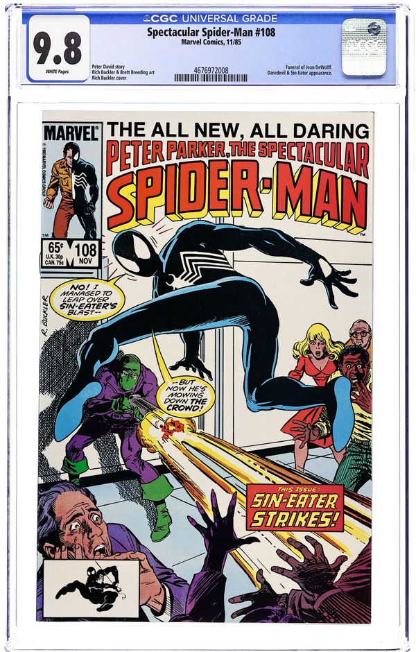 Newsstand Edition. "Original Sin" Part 1 of 4. Guest-starring Daredevil. Script by Peter David. Pencils by Rich Buckler. Inks by Brett Breeding. Cover by Rich Buckler. The critically acclaimed Death of Jean DeWolff storyline begins with this issue. In a stunning development, police captain Jean DeWolff is found murdered in her apartment. The entire city is in a state of shock over the killing including the police department, the staff at the Daily Bugle, and the Amazing Spider-Man. The web-slinger (in his black costume) begins investigating the homicide by meeting with the detective assigned to the case, Stan Carter. However, another superhero, Daredevil, gets the first shot at stopping the murderous rampage of the Sin-Eater! First appearance of the Sin-Eater. 32 pages Cover price $0.65.