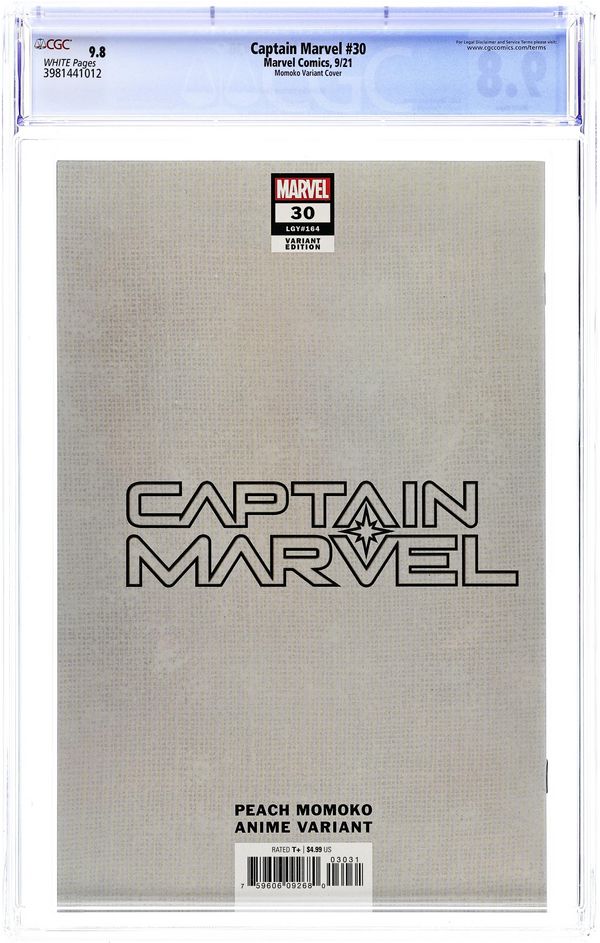 Written by Kelly Thompson, Jamie McKelvie. Art by Jacopo Camagni, Jamie McKelvie. Cover by Peach Momoko. SPECIAL OVERSIZED ISSUE! Carol Danvers thinks she's seen it all, including a terrifying future that only she can prevent. Convinced that magic is the answer to her problem, she's about to face a hard truth: No magic in the universe can save her from herself. Captain Marvel holds the lives of billions in her hands - and the decision she makes here will change her forever. Past, present and future are about to collide! Don't miss the oversized 30th issue of CAPTAIN MARVEL, including a special story written and drawn by Jamie McKelvie, the original designer of the Captain's now-iconic red, blue and yellow suit! 36 pages, full color. Rated T+ Cover price $4.99.