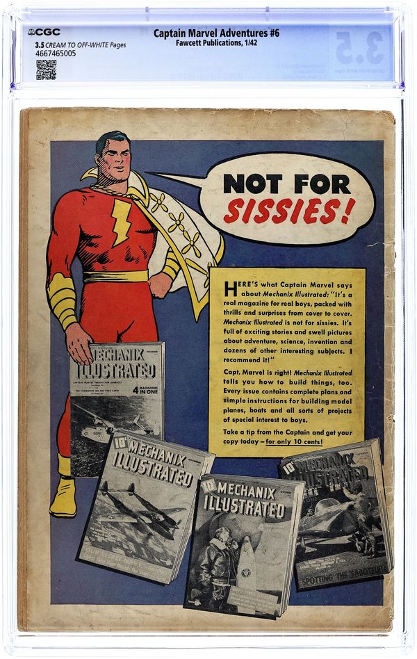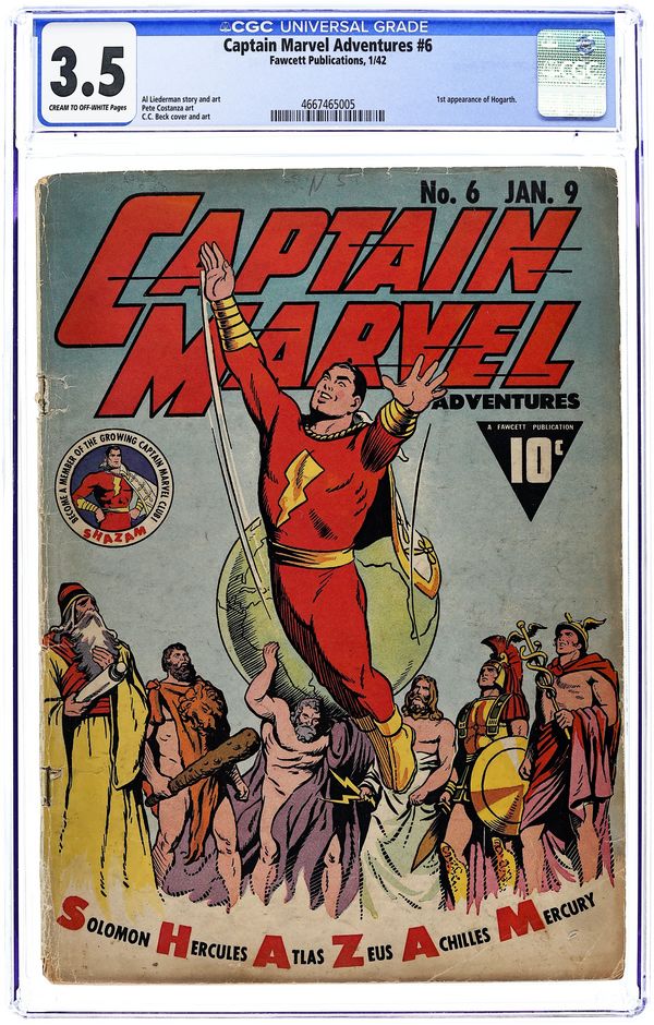 1st appearance and origin of Mary Marvel and the Marvel Family. Cover by C.C. Beck. Stories by Otto Binder, Al Liederman and unknown. Art by Marc Swayze, Al Liederman and unknown. In "Captain Marvel Introduces Mary Marvel" by Otto Binder and Marc Swayze, Billy Batson accidentally discovers that a young girl, appearing on the Station W.H.I.Z. radio show 'The Mental Marvel Quiz,' possesses half of a strange locket that he has the other half to, and that her former nurse confirms the fact that Billy and Mary are actually twins! Appearances by Captain Marvel, Jr. and Shazam. Captain Marvel also stars in: "Captain Marvel Fights a Nightmare"; "The What-Not Adventure"; and "The Three Wishes of Tim Tucker" with story by Otto Binder. Plus: Captain Kidd in an untitled tale by Al Liederman. And: 2-page text story "Killer in the North" by Carl Formes. 68 Pages, Full Color. Cover price $0.10.