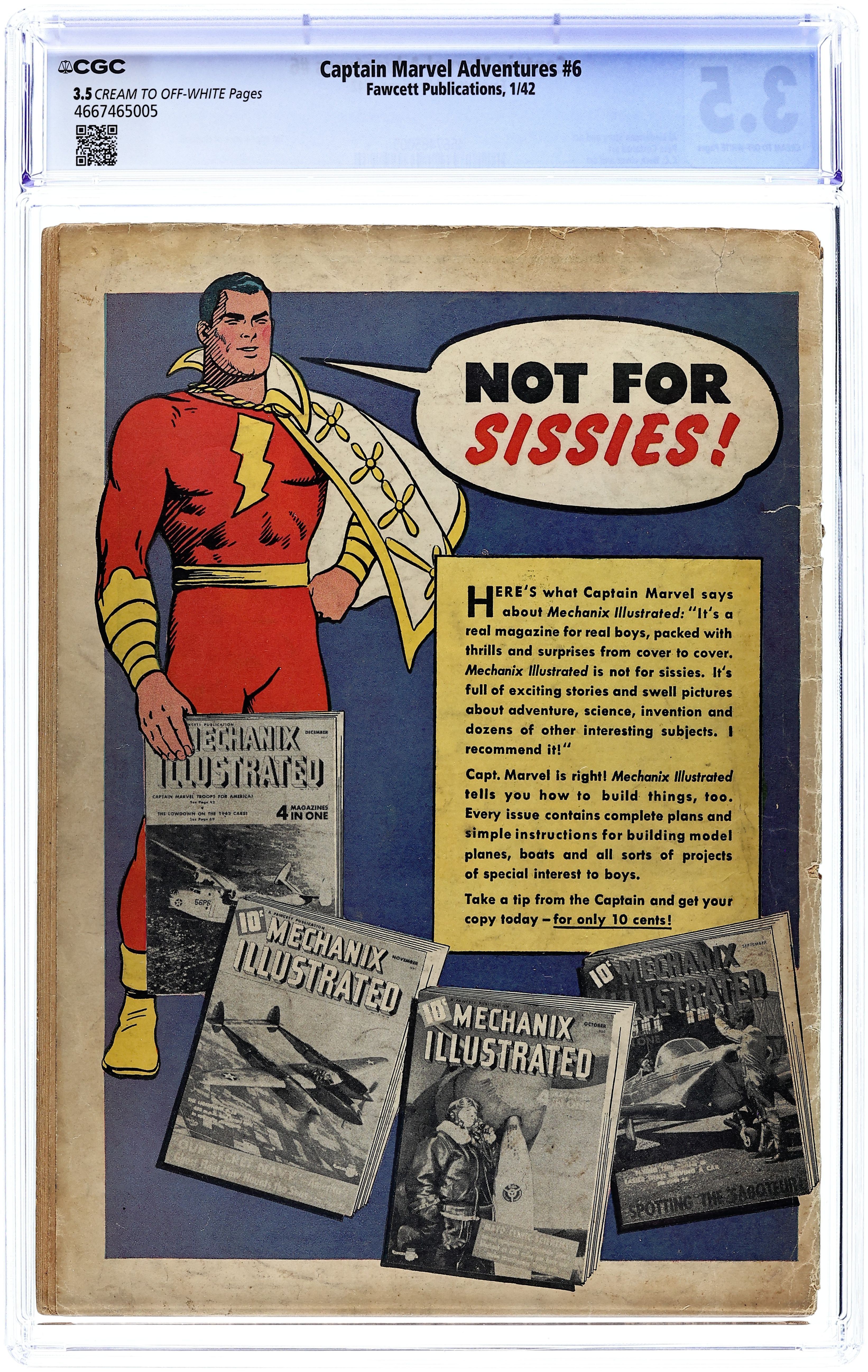 Ends Jan 12 7:39 PM CST Bid History 11 bids Current Bid $111 Your Secret Max Bid If you'd like to bid, please log in or register. Cover by C.C. Beck. Stories by Otto Binder. Art by C.C. Beck and Pete Costanza. Billy, Steamboat and others attend the gala birthday celebration of Mr. Morris, and they eat a lot of the rich birthday cake. As they depart for home, Billy tells Steamboat that he hopes that all that cake doesn't give him nightmares. Little does Billy know what lies ahead, especially when Dr. Sivana is involved in "The World's Mightiest Dream!" by Otto Binder, C.C. Beck and Pete Costanza. (Last appearance of Steamboat.) Captain Marvel also stars in "Sivana and Marvel, Inc." and "The Repentant Crook," both tales by Otto Binder and Pete Costanza. Plus: 2-page text story "Just Plain Dumb" by C.M. Steever. And: 1-page Tootsie Roll ad "Captain Tootsie Captures the Red Terror!" with art by Beck and Costanza. 36 Pages, Full Color. Cover price $0.10.