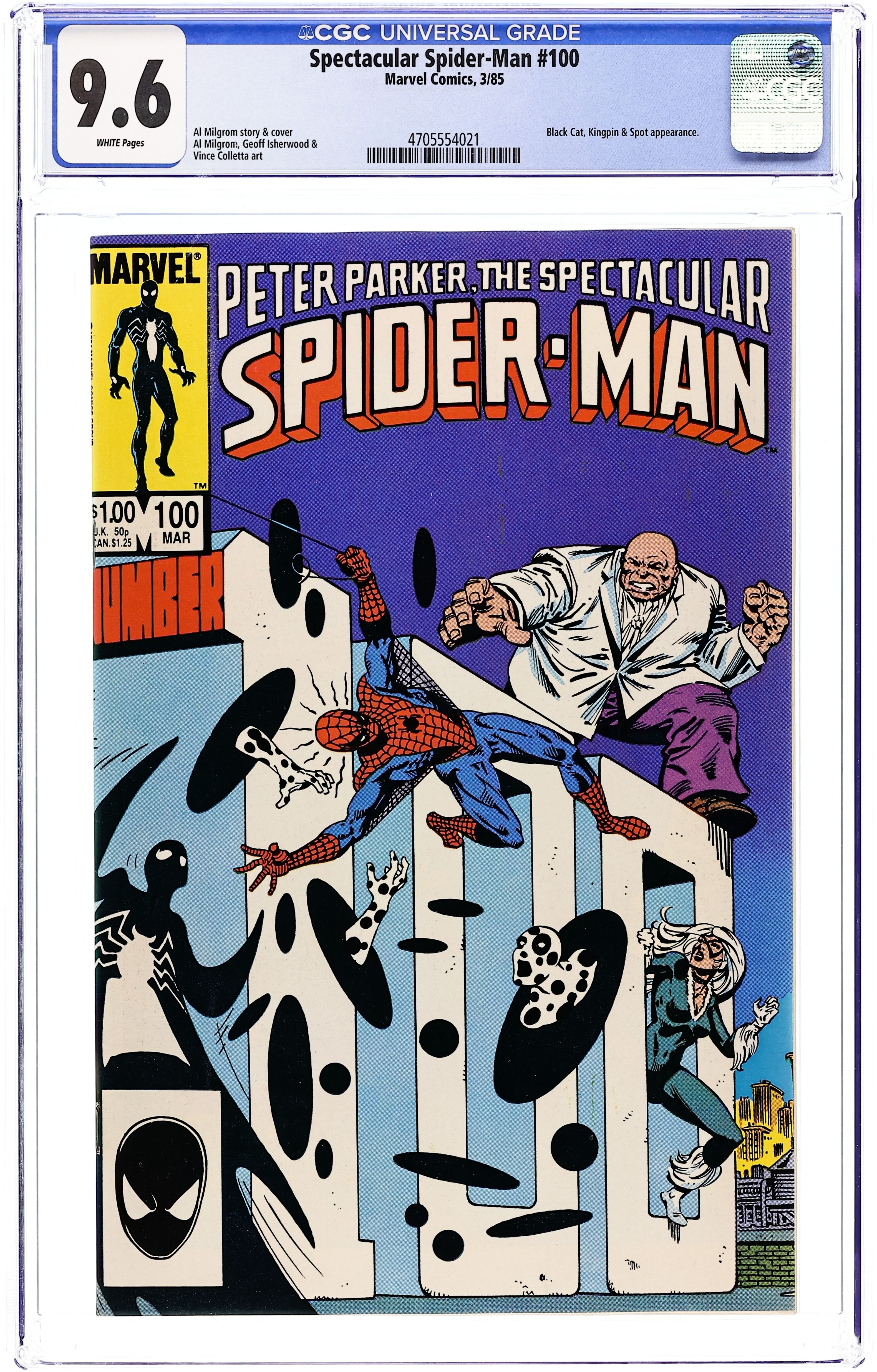 Direct Edition. "Breakin'!" Double-sized issue. Script and Pencils by Al Milgrom. Inks by Vince Colletta and Geof Isherwood. Cover by Al Milgrom. The wall-crawler returns to the Kingpin's skyscraper, but again runs into the pesky Spot! While Spider-Man fights the Spot, the Black Cat confronts the Kingpin and learns the tragic secret of her bad luck powers. A dejected Felicia elects not to attack the massive crime boss, but a few minutes later...the Spectacular Spider-Man does! It's a great slugfest between the Kingpin and the web-slinger! Meanwhile, as the battle is raging at the Kingpin's tower, the alien symbiote slips into Peter Parker's closet...and waits! (Note: The alien symbiote plot line continues in Web of Spider-Man 1.) 48 pages Cover price $1.00.