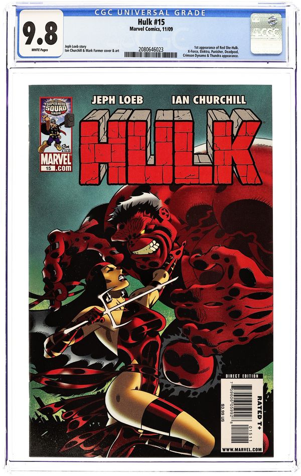 Cover by IAN CHURCHILL. CODE RED: Part 4 of 4 - Written by JEPH LOEB Art by IAN CHURCHILL. Superstars JEPH LOEB and IAN CHURCHILL bring you the final chapter of CODE RED. Is RED HULK strong enough to throw down with WOLVERINE, PUNISHER, DEADPOOL, the all-new RED SHE-HULK, and more? Find out, as new secrets are revealed as the stage is set for WORLD WAR HULKS. Plus: "Hulk Tonsils," a tale of the colorful Hulks by Audrey Loeb & Dario Brizuela. 32 PGS./Rated T+ Cover price $3.99.