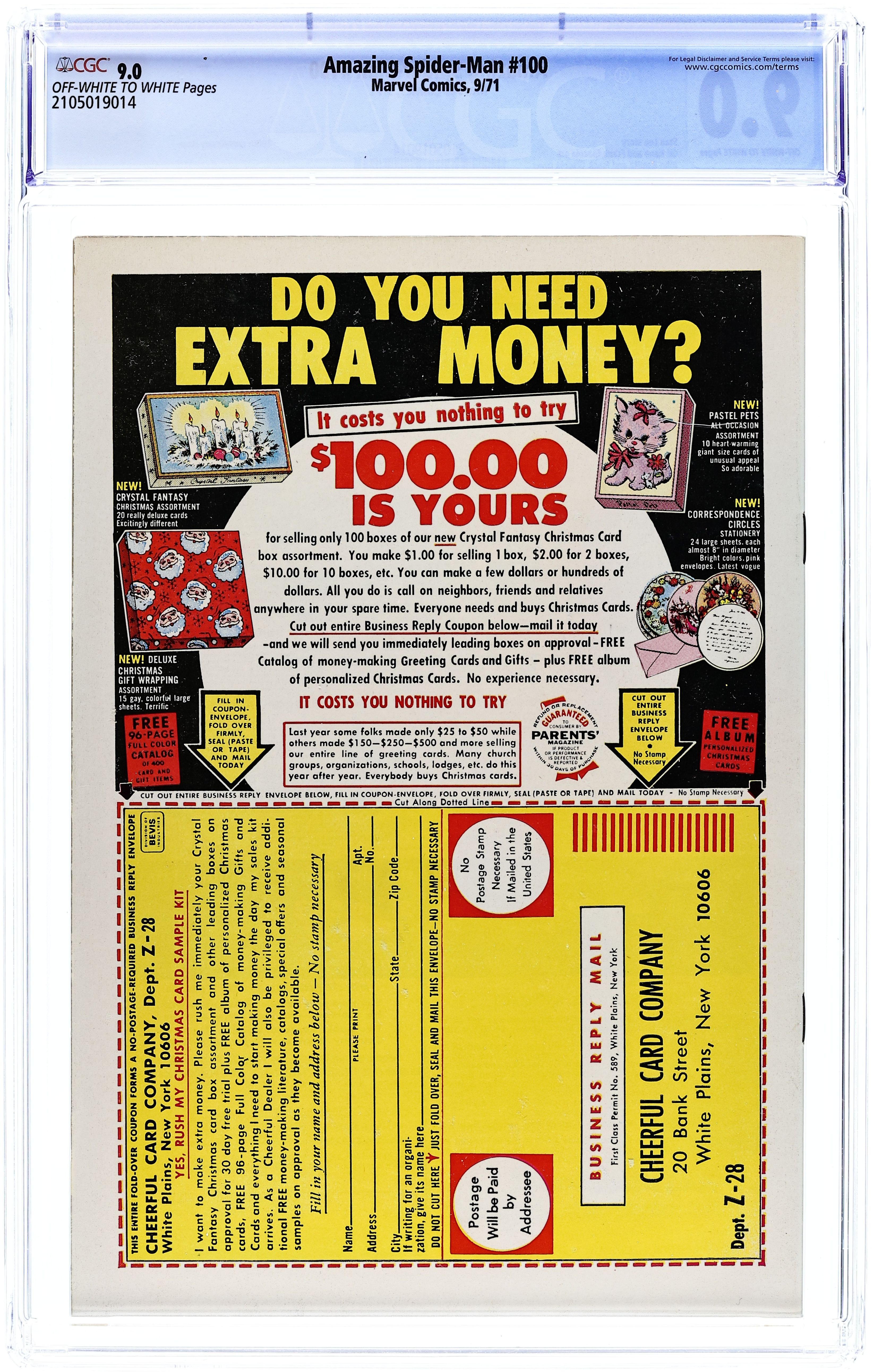 "The Spider of the Man?" Script by Stan Lee. Pencils by Gil Kane. Inks by Frank Giacoia and Tony Mortellaro (backgrounds). Cover by John Romita and Frank Giacoia. It's the 100th anniversary issue of the Amazing Spider-Man title -- with an all-time cover! Peter Parker wants to live a normal life with Gwen Stacy. But he doesn't think he can as long as he has his spider-powers. So, with that thought in mind, the young scientist creates a special potion -- which he believes will eliminate his remarkable abilities. After Peter drinks the potion, he lies down to sleep. And when he wakes up...he gets the biggest shock of his amazing life! Flashback cameos by Aunt May, J. Jonah Jameson, Betty Brant, Gwen Stacy, and Captain Stacy. (Notes: There have been many homages to John Romita's classic cover including the covers to Marvel Tales 100, Ultimate Spider-Man (2000) 100B, and Peter Parker (2017) #1EBAY. This story was reprinted in Marvel Treasury Edition #14 and Marvel Tales 253.) 36 pages. Cover price $0.15.