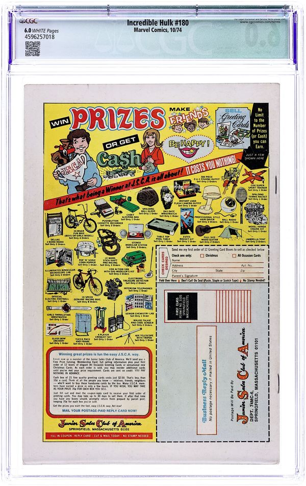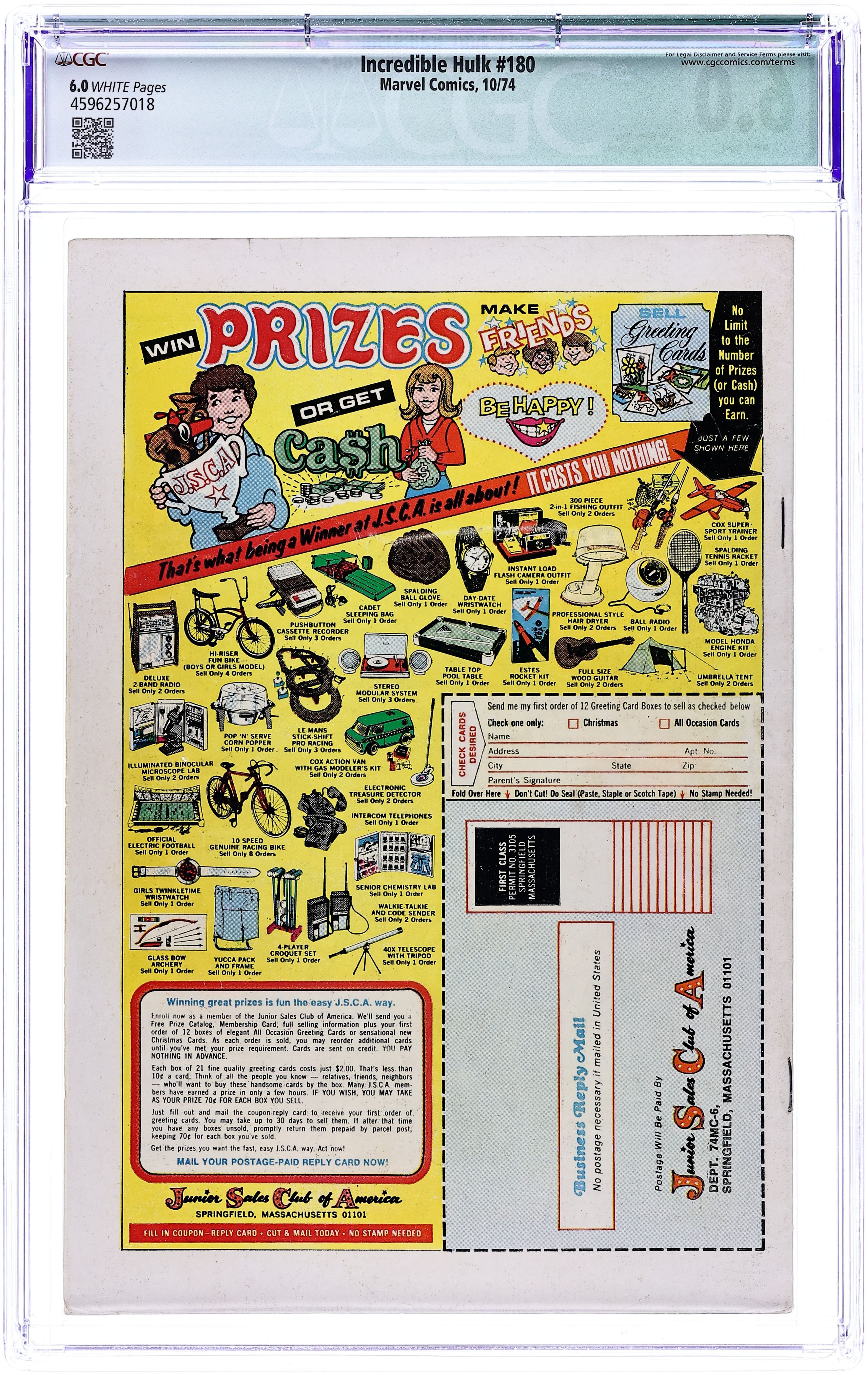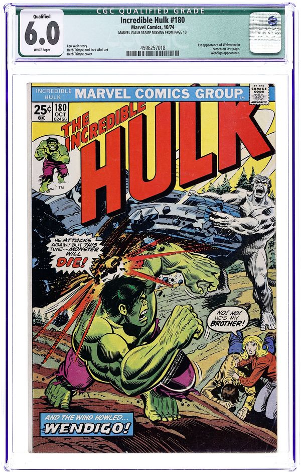 First appearance of Wolverine (cameo last panel). Cover art by Herb Trimpe. And the Wind Howls...Wendigo!, script by Len Wein, pencils by Herb Trimpe, inks by Jack Abel; Hulk is in Canada looking for some peace and quiet when he is mysteriously drawn to a cave inhabited by the sister of the man who became the Wendigo; Marie and Georges plan on transferring the power of the Wendigo to the Hulk, thus restorin Paul Cartier to his normal life; Marie's magic isn't strong enough, however, and just as Wendigo shows up, the Hulk wakes up from his magical slumber and the two battle; The Canadian government gets involved and sends in their own agent to take care of a recent Hulk sighting, the mutant known as Wolverine. Marvel Value Stamp Series A (Cyclops). 36 pgs. $0.25. Cover price $0.25.