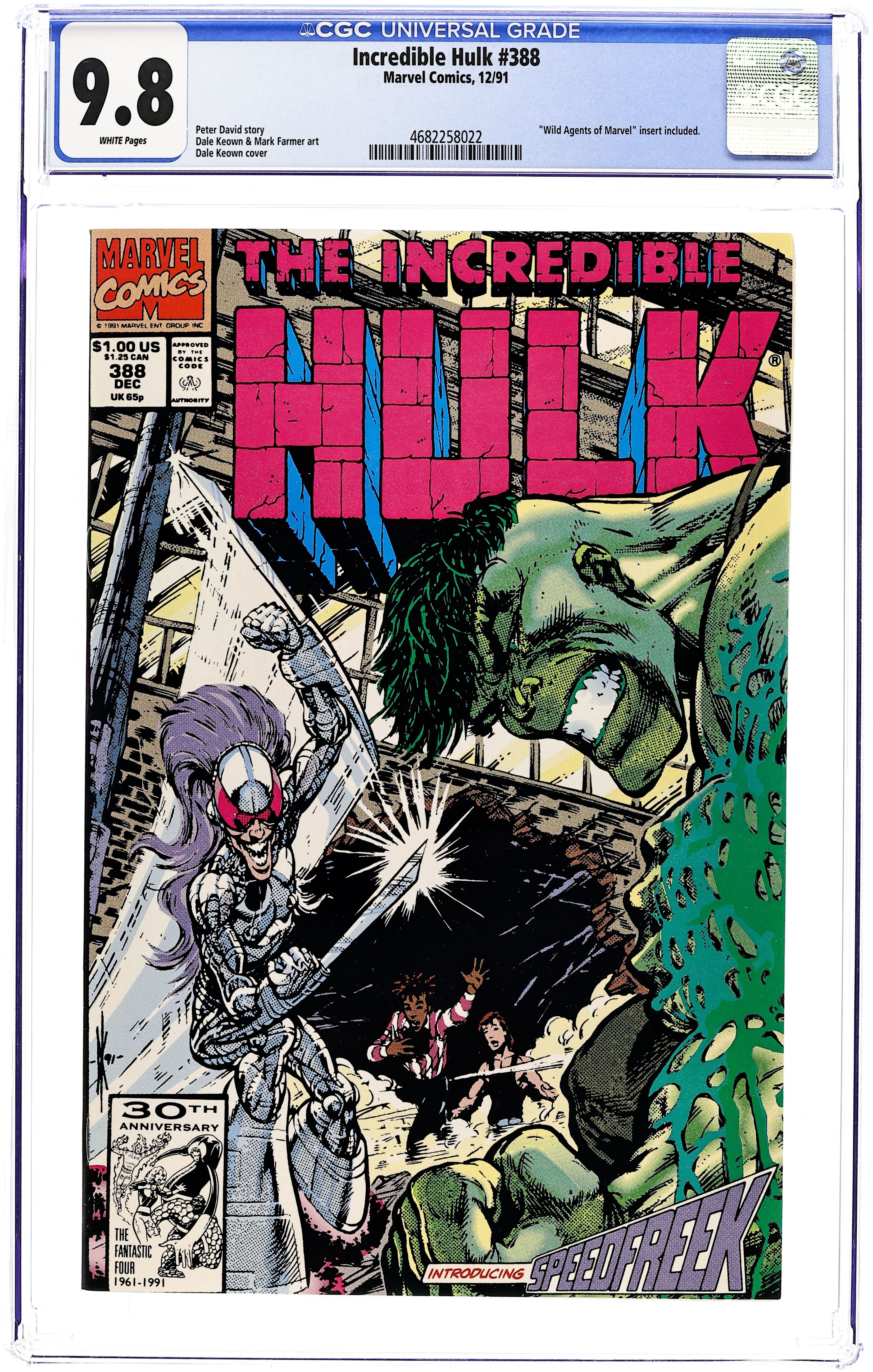 Direct Edition. In the very unusual Hulk story "Thicker Than Water," a crime boss enlists the Speedfreek to kill the man who gave his son AIDS. Characters: V: Speedfreek (I; Shappe); GS: Jim Wilson (revealed to have AIDS), Hector, Ulysses. Written by Peter David, with art by Dale Keown and Mark Farmer. Cover by Dale Keown. 40 pgs. Cover price $1.00.