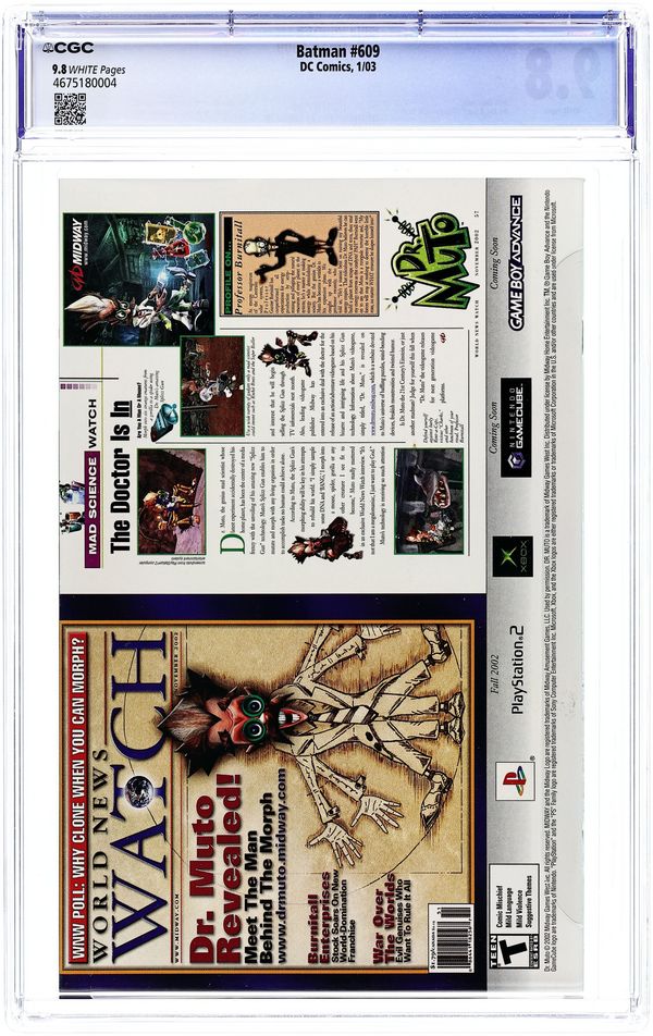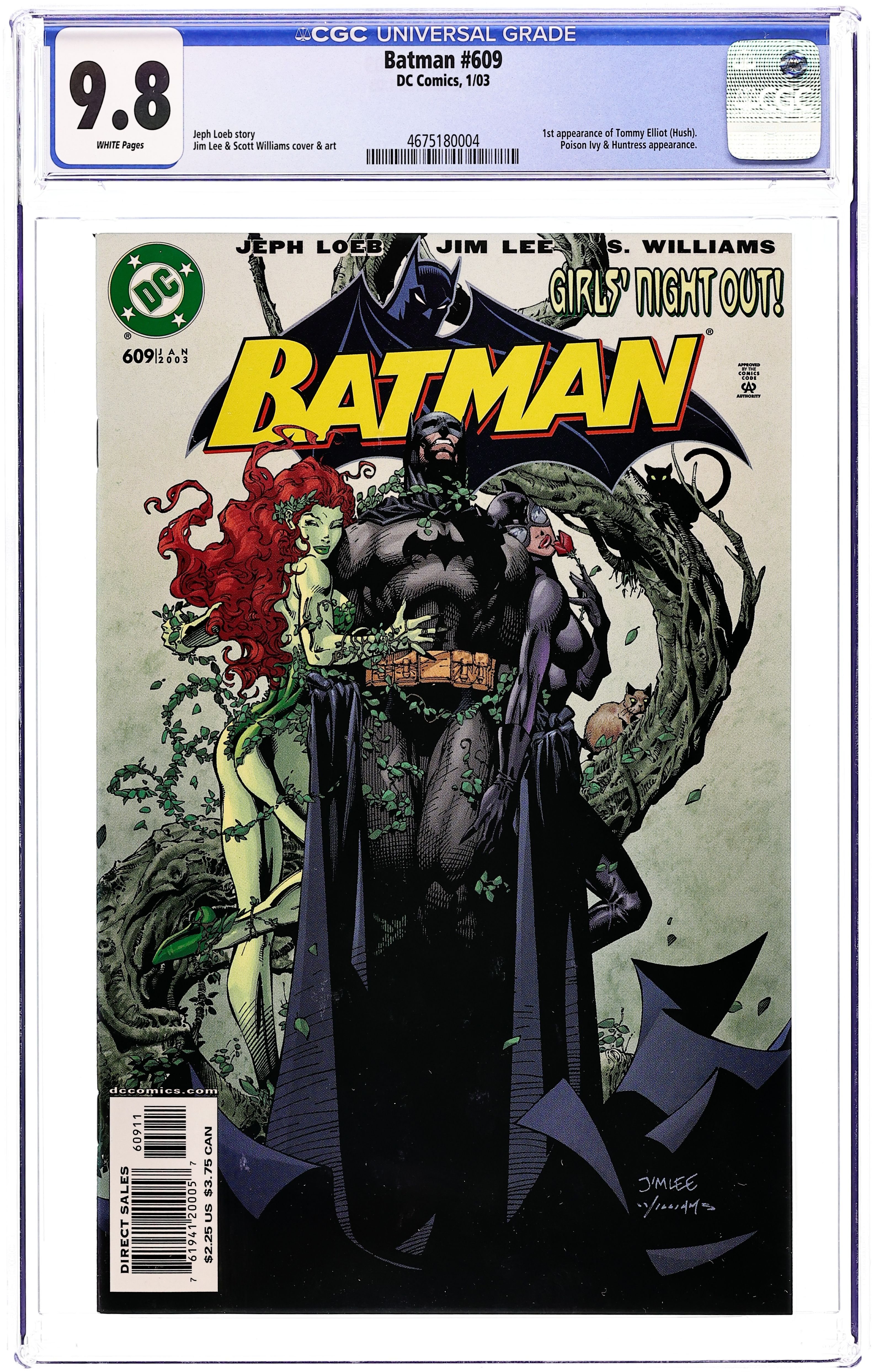 Direct Edition. WRITTEN BY JEPH LOEB; ART AND COVER BY JIM LEE AND SCOTT WILLIAMS In stores November 27. Jeph Loeb & Jim Lee continue their run on BATMAN with Part 2 of the 12-part "Hush." Lying near death, Batman must turn to the least likely person from the Bat family for help: the Huntress! Meanwhile, Catwoman continues to hunt down the mysterious individual responsible for wreaking havoc in their lives ? a path that leads her back to Poison Ivy. 48 Pages, Full Color. Cover price $2.25.