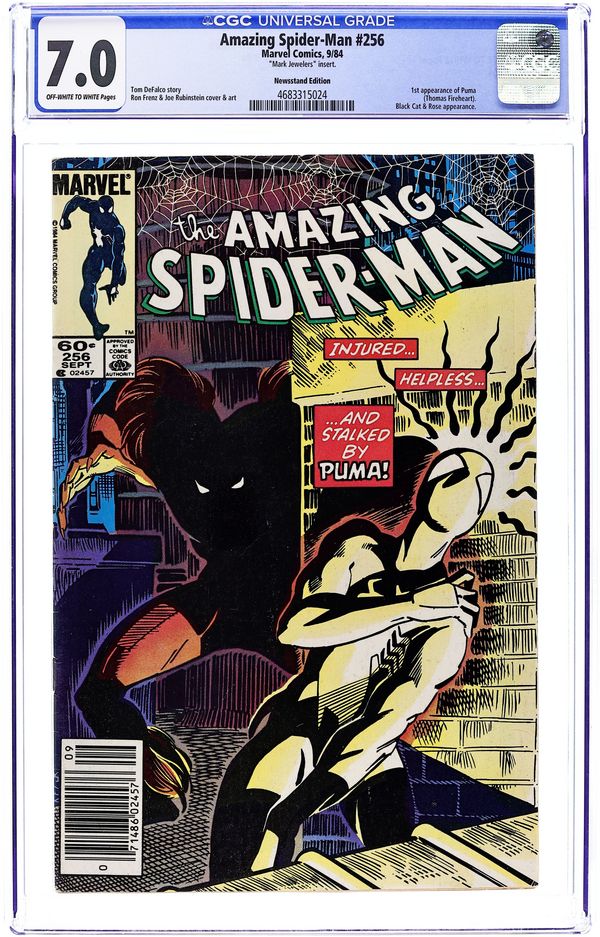 Mark Jeweler Advertisement Insert Variant. "Introducing...Puma!" Part 1 of 2. First appearance of Puma. Script by Tom DeFalco. Pencils by Ron Frenz. Inks by Joe Rubinstein. Cover by Ron Frenz and Joe Rubinstein. The Rose is tired of the web-slinger interfering in his criminal activities! So the underworld boss brings in an assassin from the American Southwest! Puma! Spidey doesn't much about Puma (aka Thomas Fireheart), but he will...very soon! In the meantime the black symbiote costume keeps Peter Parker up past his bedtime...and then some! Cameo appearances by the Black Cat, Mary Jane Watson, Betty Brant Leeds, and Joe Robertson. (Note: This two-part story was reprinted in Marvel Tales 270 & 271.) Cover price $0.60.