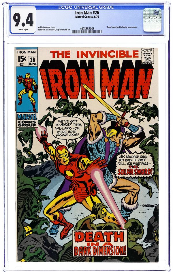 "Duel In A Dark Dimension!" Story by Archie Goodwin. Art by Don Heck and Johnny Craig. The Collector wants to add the Freak (aka Happy Hogan) to his intergalactic collection! So the ancient elder of the universe abducts Pepper Hogan to lure her husband and Iron Man to his spaceship. After the Collector captures Happy, he proposes a trade to Iron Man. If Shell-head can obtain the solar sword from the dark dimension, the Collector will release both Pepper and Happy. Will the golden avenger betray Val-Larr, the owner of the solar sword, in order to save his friends? 32 pages Cover price $0.15.