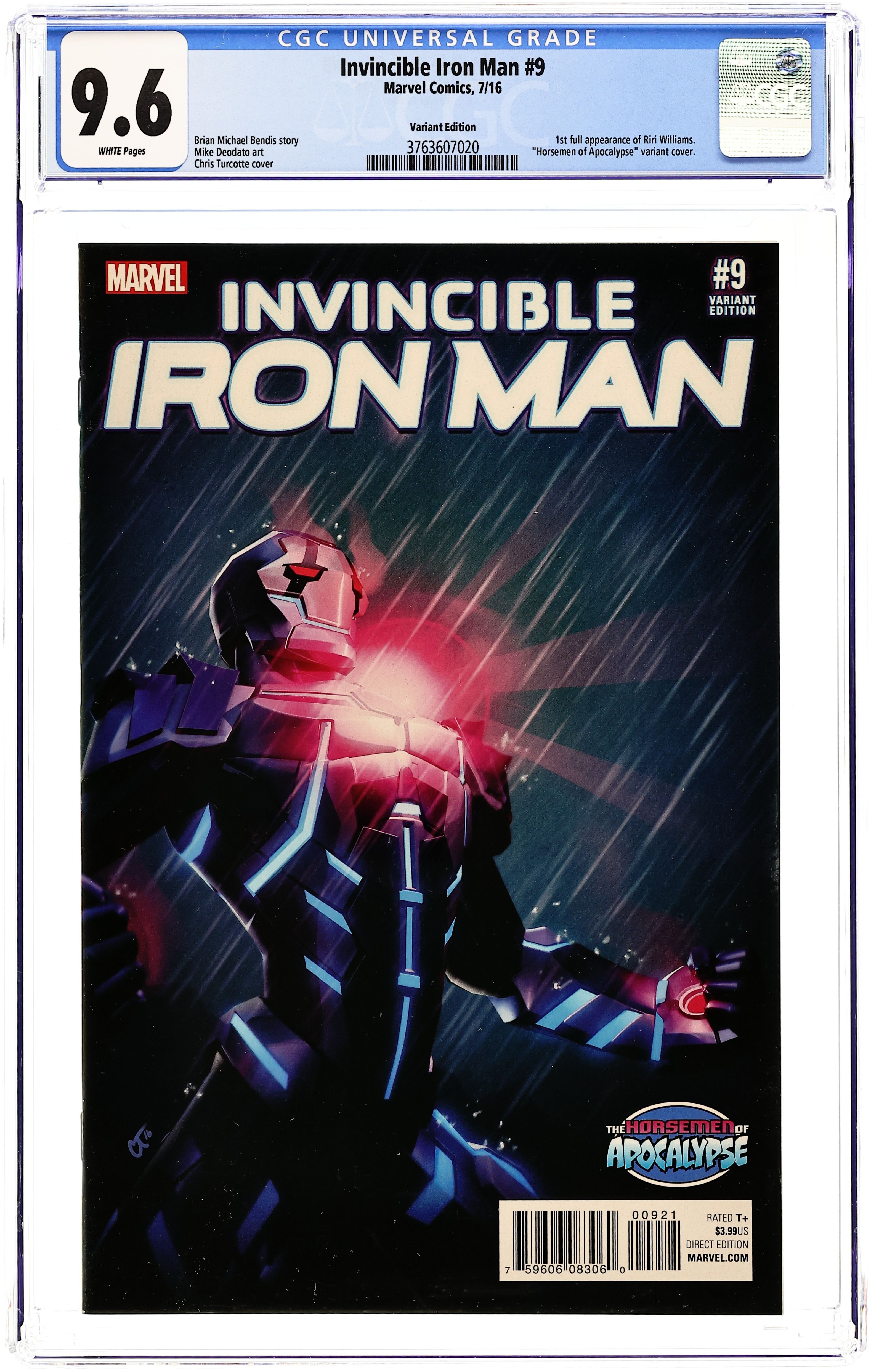 Limited 1 for 10 Retailer Incentive Variant Cover. Written by Brian Michael Bendis. Art by Stefano Caselli. Cover by Mike Deodato. Riri Williams has new armor technology that just might change the face of the Marvel Universe forever… if she survives the experience. The biggest story in comics starts to unfold right here. 28 pages, full color. Rated T+ Cover price $3.99.