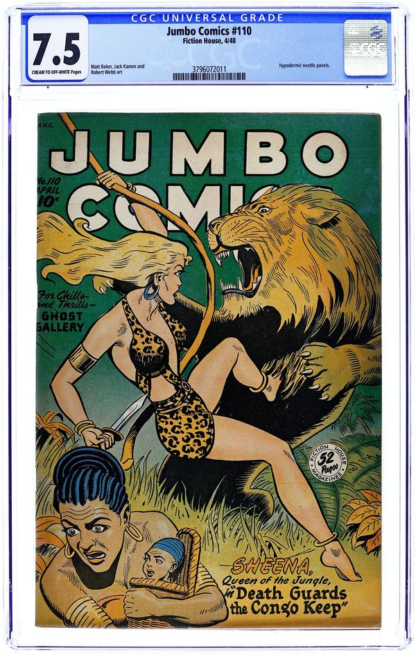 Cover by Dan Zolnerowich. Edited by Malcolm Reiss and Jerry Iger. Stories and art by Will Eisner, Jerry Iger, Art Saaf, Sy Reit, Mort Leav, Bob Kane and Robert Webb. An influential anthology starring jungle hero Sheena, featuring early art by legendary comics artists in the Eisner-Iger Shop. Sheena encounters slavers, voodoo and treasure in the jungle; Time-traveler Stuart Taylor visits ancient Greece and encounters Medusa, Mercury and the Oracle of Delphi; A Jumbo Laffs joke page is drawn by Batman creator Bob Kane. The Hawk; Weird Stories of the Supernatural; Bobby; Sheena, Queen of the Jungle; Midnight the Black Stallion; Tom Dick and Harry; Suicide Channel; Jumbo Laffs; ZX-5 Spies In Action; Inspector Dayton; Lightning. 68 pages, Full Color. Cover price $0.10.