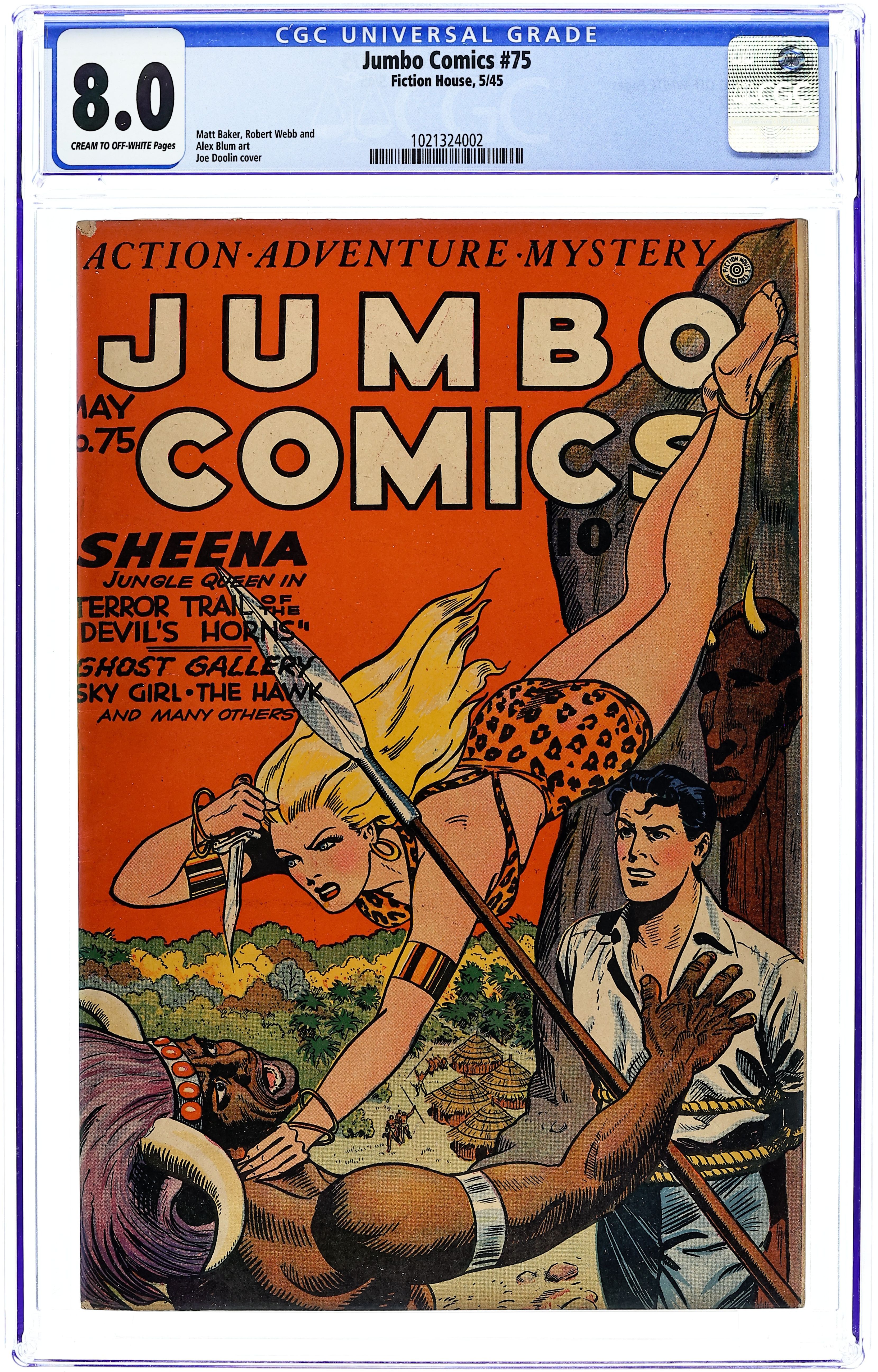 Cover by Joe Doolin. Edited by Jerry Iger. Stories and art by Matt Baker, Alex Blum, and Robert Webb. An influential anthology starring jungle hero Sheena, featuring early art by legendary comics artists in the Eisner-Iger Shop. A woman runs afoul of hostile natives while tracking her father's killer; Pirate queen Velvet thinks she's found the lost heir to the throne of France; Time-traveler Stuart Taylor meets legendary French swordsman Cyrano de Bergerac. Another classic Sheena cover by Joe Doolin. The Hawk; Weird Stories of the Supernatural; Sheena, Queen of the Jungle; Ghost Gallery; Dutch Courage; ZX-5 Spies In Action; Sky Girl. 48 pages, Full Color. Cover price $0.10.
