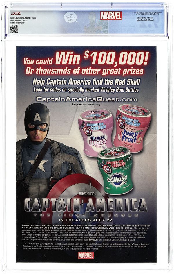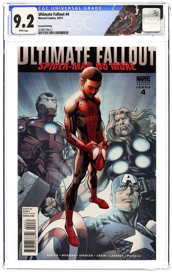 2nd Printing. Written by BRIAN BENDIS, JONATHAN HICKMAN & NICK SPENCER. Art by SARA PICHELLI, SALVADOR LARROCA & CLAYTON CRAIN. Cover by MARK BAGLEY. What will become of Captain America? Where have all the X-Men gone? And what is up with the new Spider-Man suit? Don't miss the final chapters of one of the most talked about Ultimate events ever. 32 PGS. (each)/Rated T+...$3.99 (each) Cover price $3.99.