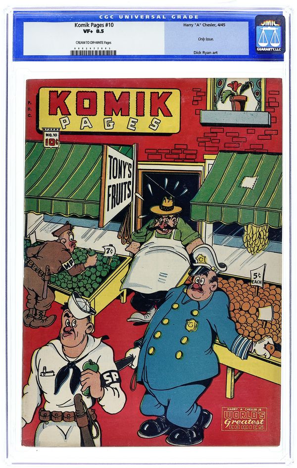 Cover by Joe Beck. Stories and art by Charles Biro, Bob Wood, Dick Ryan, Joe Beck, Otto Eppers, Russell Keaton, Rick Yager, Cal Cagno, Fred Schwab and Fred Guardineer. An early comics anthology published by Harry Chesler. Happy Landing accidentally gets an adrenaline shot instead of a tetanus shot, and becomes a super-soldier for an exactly one enemy engagement. Short comedy strips, sometimes just one panel, with titles like Wise Crackers and Shinanigans. Historical and educational strips, including little-known facts about animals, and the adventures of King Arthur. Also featuring early humor strips by Charles Biro and Bob Wood, later the minds behind the notorious Crime Does Not Pay comic. Tenderfoot Joe; Tenderfoot Mary; Wild West Junior; Happy Landing; Gooby-Land; Animal Wise Crackers; Cowboy Jake; Lyin' Lou; Pokey Forgets to Remember; The Age of Animals; Bright and Early; Tom, Dick, and Mary; Dot and Dash; Land o' Nod; Red Starr; Professor McScrewy; Ima Sphinx; Court of Inhuman Relations; Jest the Type; Joe McGee; G-Whizz; Round Table Adventures; Foxy Grandpa; Runt and Tuffy; Shinanigans; Cheerio Minstrels; King Kole's Kourt. 48 pages, Full Color. Note: #10 is the only issue (#1 on inside indicia). Cover price $0.10.