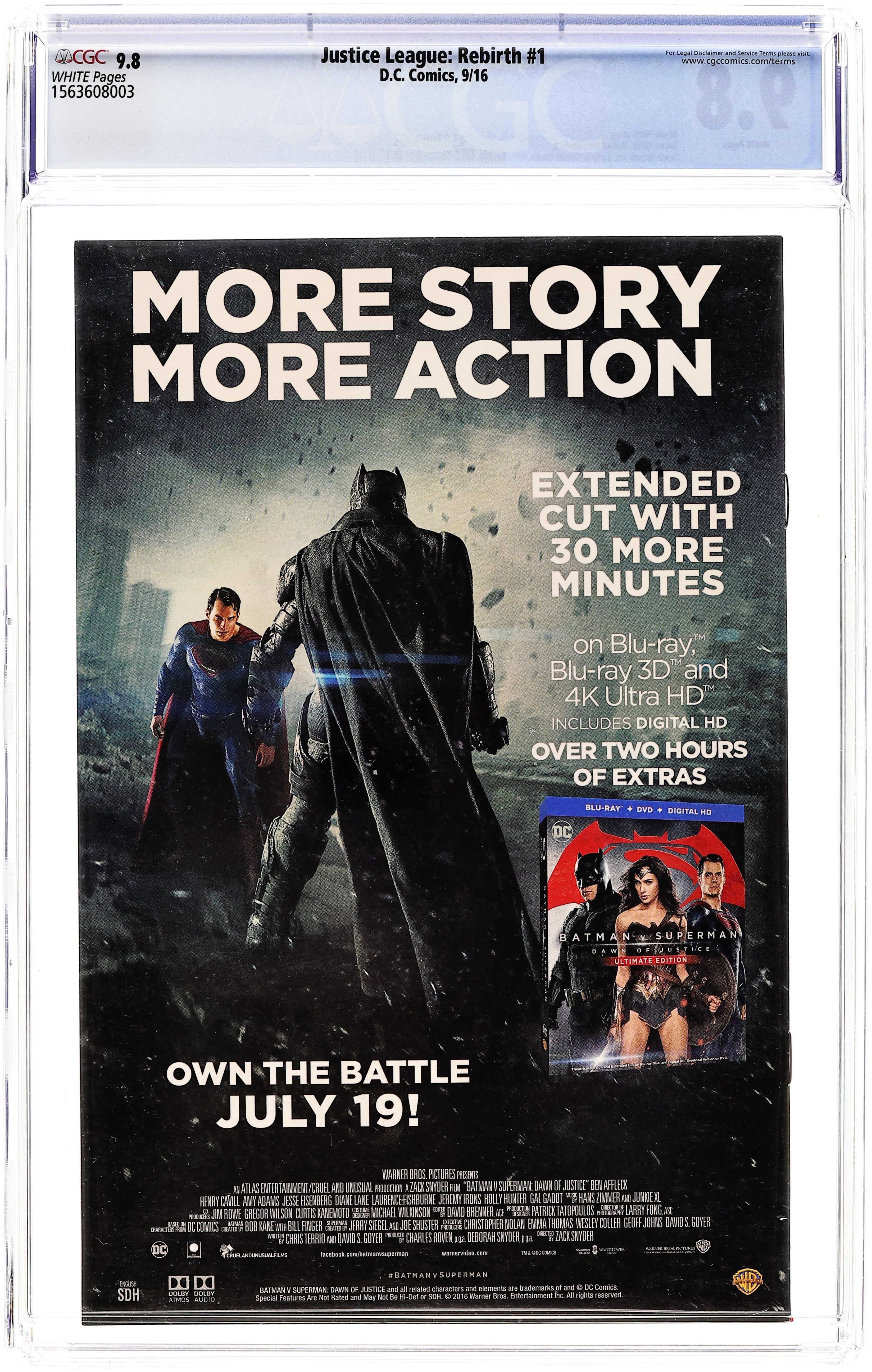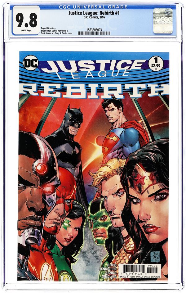 Story and Art by Bryan Hitch. Cover by Tony S. Daniel. Spinning out of the events of DC UNIVERSE: REBIRTH #1, a new day dawns for Earth's greatest heroes as they welcome three new members to the team, including…Superman? Who is this strange visitor from a dead world-and can he be trusted? Batman and Wonder Woman aren't so sure. 32 pages, full color. Rated T Cover price $2.99.