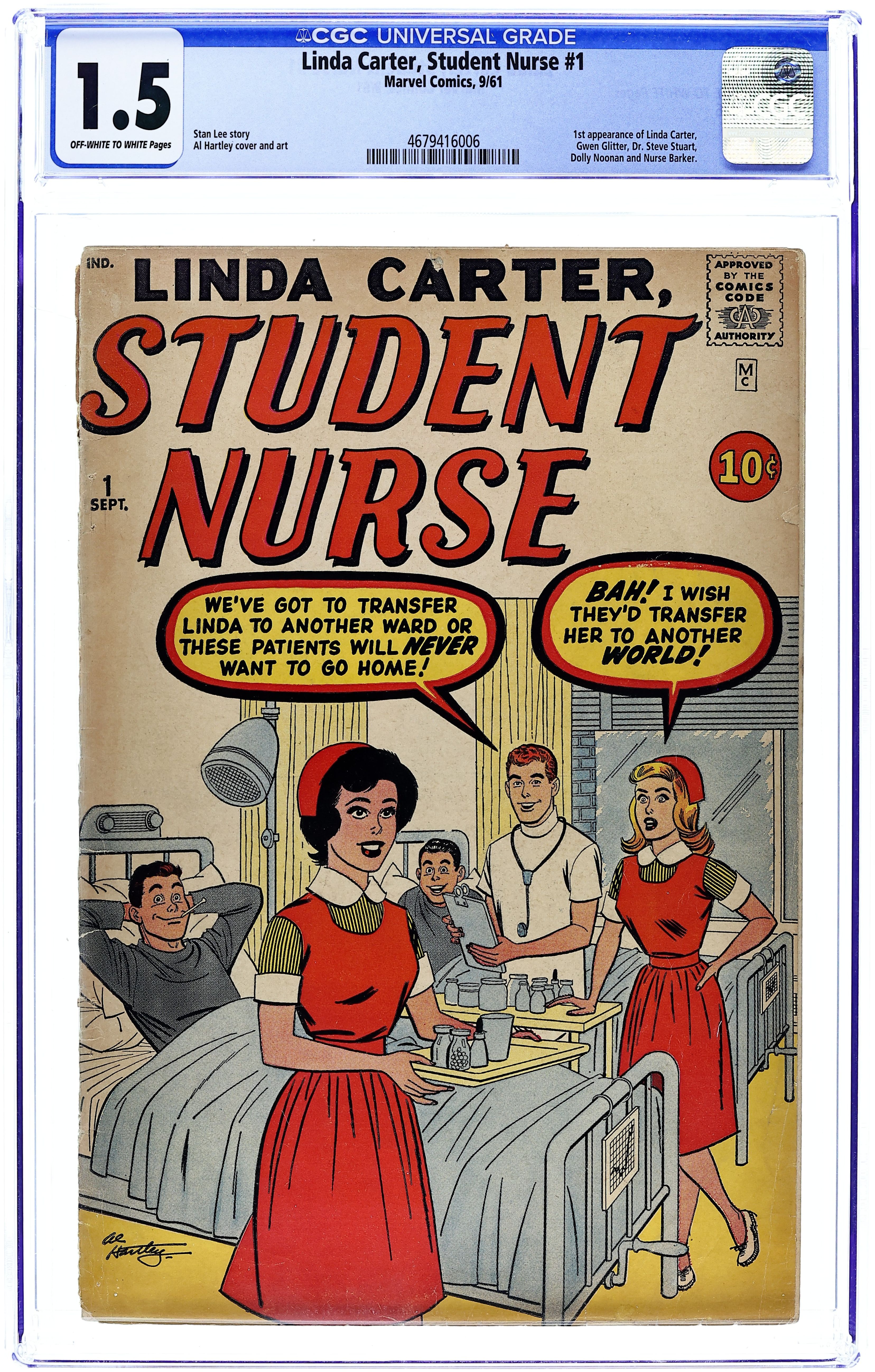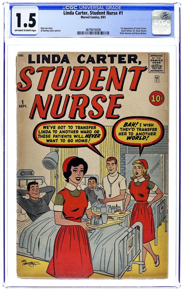 Stories by Stan Lee. Art and Cover by Al Hartley. All the warmth, drama and romance of a nurse's life at a big city hospital! Linda Carter, Student Nurse in: three untitled stories; "Linda's Lovely Fashions" activity page; two untitled 2-pagers; and one untitled 1-pager. Plus: "Good Night, Nurse!" activity page; "Gwen Glitter's Gorgeous Clothes!" activity page; 2-page text story "The Model" (creators unknown); and "Let's Dress the Boys!" activity page. 32 pages, full color. Cover price $0.10.