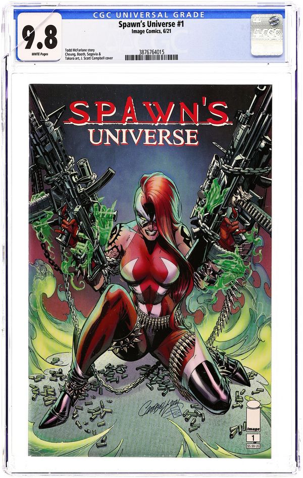 Limited 1 for 50 Retailer Incentive Variant Cover. Written by Todd McFarlane. Art by Jim Cheung. Cover by Brett Booth. IT'S HERE: THE OFFICIAL INTRODUCTION TO THE LONG-AWAITED SPAWN'S UNIVERSE! A double-sized issue that begins a storyline so huge that three NEW SPAWN-related monthly titles will spill out from it, including… A new SPAWN title. GUNSLINGER SPAWN monthly. And a new TEAM book bringing a handful of these characters together in their own book. 64 pages, full color. Cover price $5.99.