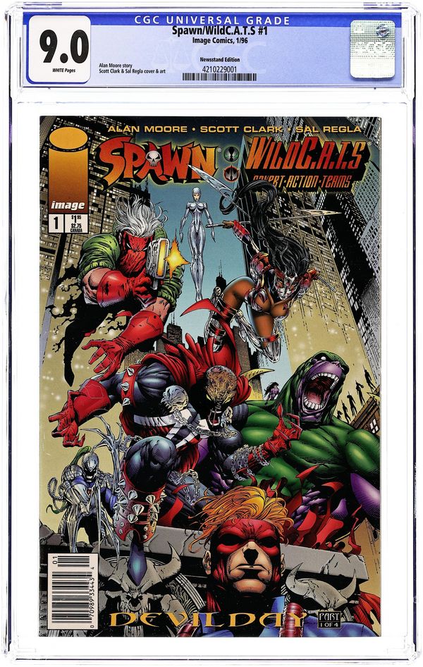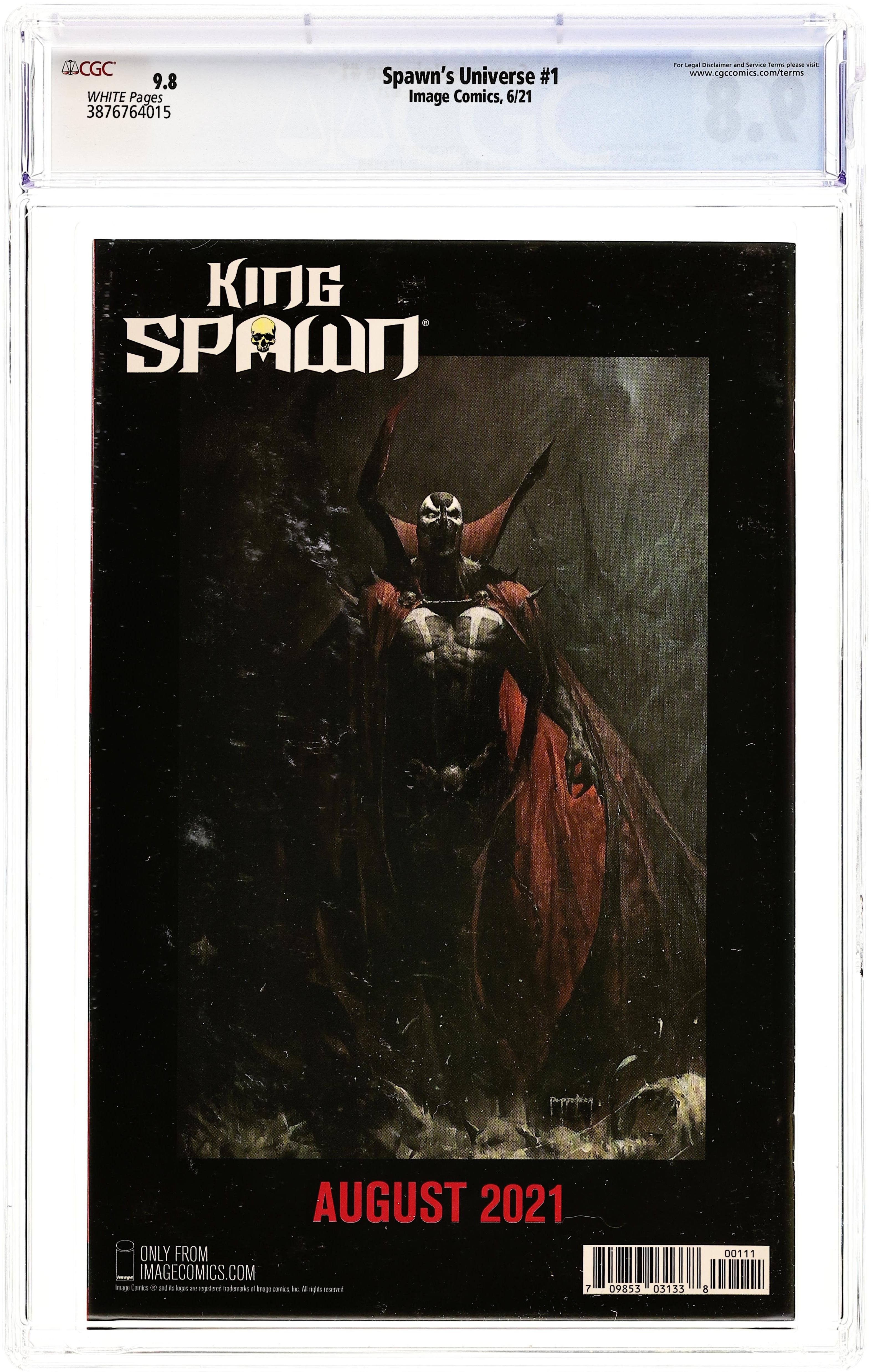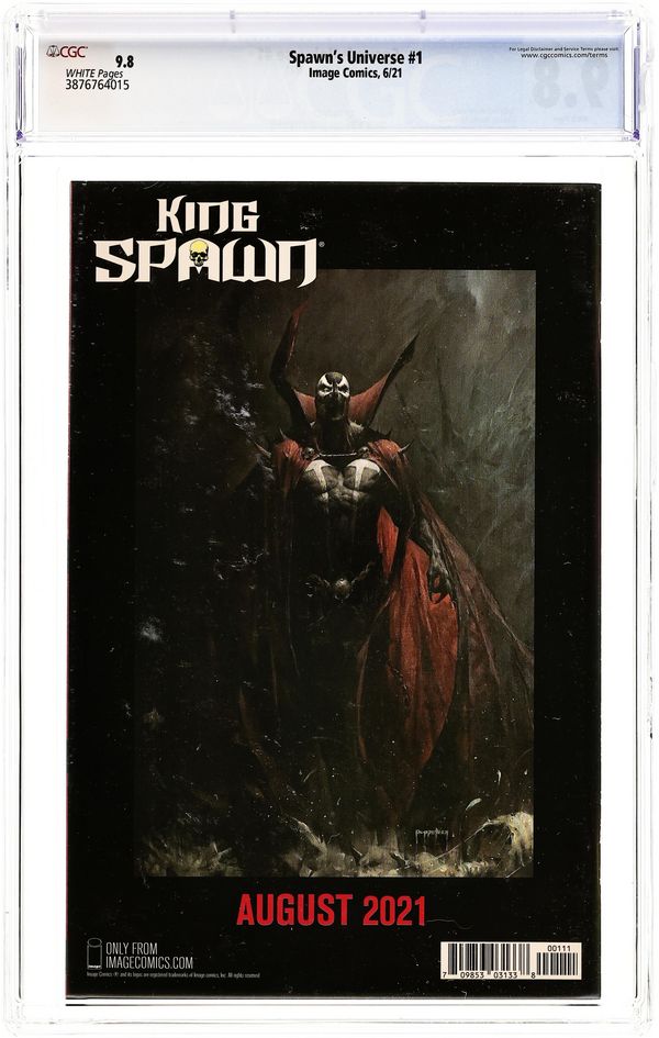 Written by Todd McFarlane. Art by Jim Cheung. Cover by Brett Booth & Todd McFarlane. IT'S HERE: THE OFFICIAL INTRODUCTION TO THE LONG-AWAITED SPAWN'S UNIVERSE! A double-sized issue that begins a storyline so huge that three NEW SPAWN-related monthly titles will spill out from it, including… A new SPAWN title. GUNSLINGER SPAWN monthly. And a new TEAM book bringing a handful of these characters together in their own book. 64 pages, full color. Cover price $5.99.