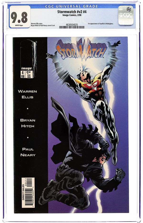A Finer World: Part 1 of 3 - Written by Warren Ellis. Art by and cover Bryan Hitch and Paul Neary. StormWatch Black – a special unit of StormWatch that officially doesnt exist – discovered a deadly plot by International Operations to conduct biological war-games. Heading to Pavane, Louisiana the team began their investigation, despite the fact that the American government had forbid them from operating on U.S. soil. Exerting diplomatic pressure on France, Weatherman Jackson King was able to coerce its Prime Minister to invoke code perfect, the loophole that allows StormWatch to land and protect endangered citizens in any foreign territory. However, during the battle that ensued, StormWatch learned the secret identity of the man who helped facilitate the entire deadly chemical exercise – the mad ex-StormWatch Weatherman, Henry Bendix! 32 pages, FC. NOTE: 1st appearance of Apollo and The Midnighter. Cover price $2.50.
