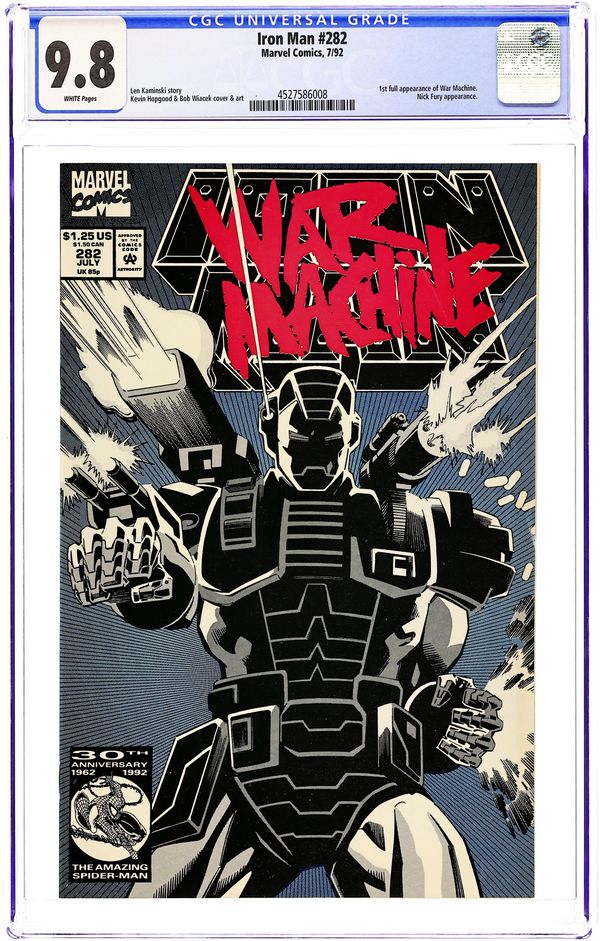 Newsstand Edition. "War Machine" Part 2 of 3. First (full) appearance of the War Machine armor. Script by Len Kaminski. Pencils by Kevin Hopgood. Inks by Bob Wiacek. Cover by Kevin Hopgood and Bob Wiacek. The Masters of Silence came to Stark Enterprises last issue looking for a fight! And now the trio is getting one in spades thanks to the War Machine armor! In a remarkable display of firepower; Tony Stark, clad in the new gray & white armor, trounces his would-be assassins! In the meantime, Jim Rhodes contacts SHIELD to learn who framed Stark Enterprises for the deadly accident in Japan! And it turns out to be someone the armored avenger knows very, very well! Cameo appearances by Justin Hammer and Nick Fury. (Note: The cover to issue 282 was reprinted as the cover to Iron Man (1968 1st series) Marvel Legends Reprint 281.) 32 pages. Cover price $1.25.