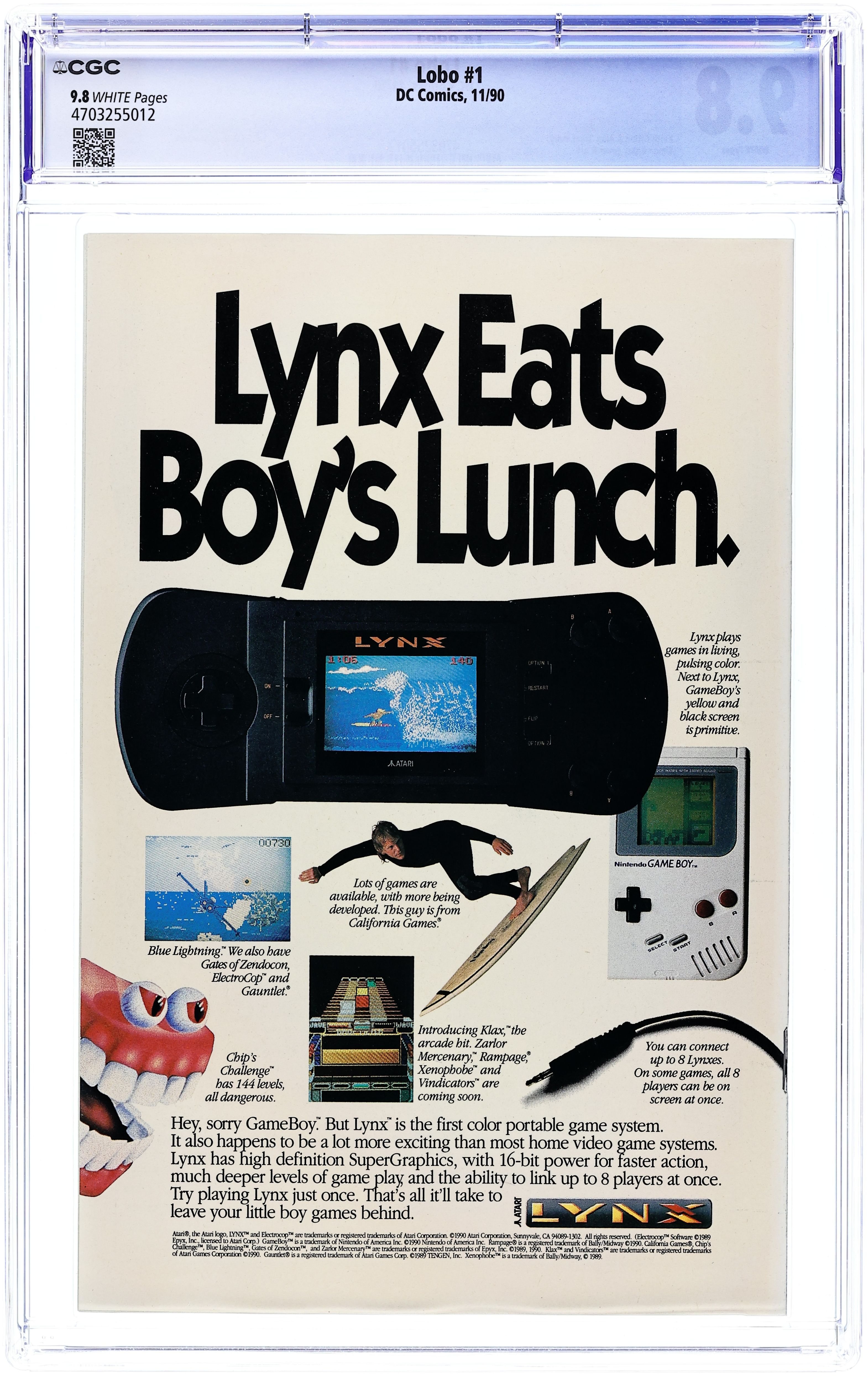 Cover art by Norm Breyfogle. "True Stories of the Highway Patrol," script by Alan Grant, art by Norm Breyfogle; Highway Patrol officers, Broderick and Crawford, kill time playing "I Spy" while behind a billboard patrolling Route 66; A super fast vehicle races past; They turn on their siren and pursue the lawbreaking Lobo, who ignores the police tailing him as he almost runs down an elderly Native American with his hawg; The Main Man catches up to a red convertible and wolf-whistles at the babe driving; Concentrating on the blonde, Lobo fails to notice the patrol car trying to stop him on his left, and concentrating on the callous motorcyclist, the police fail to notice the truck heading straight for them; Later, drug-taking and gunplay ensue. 36 pgs., full color. $2.25. Cover price $2.25.