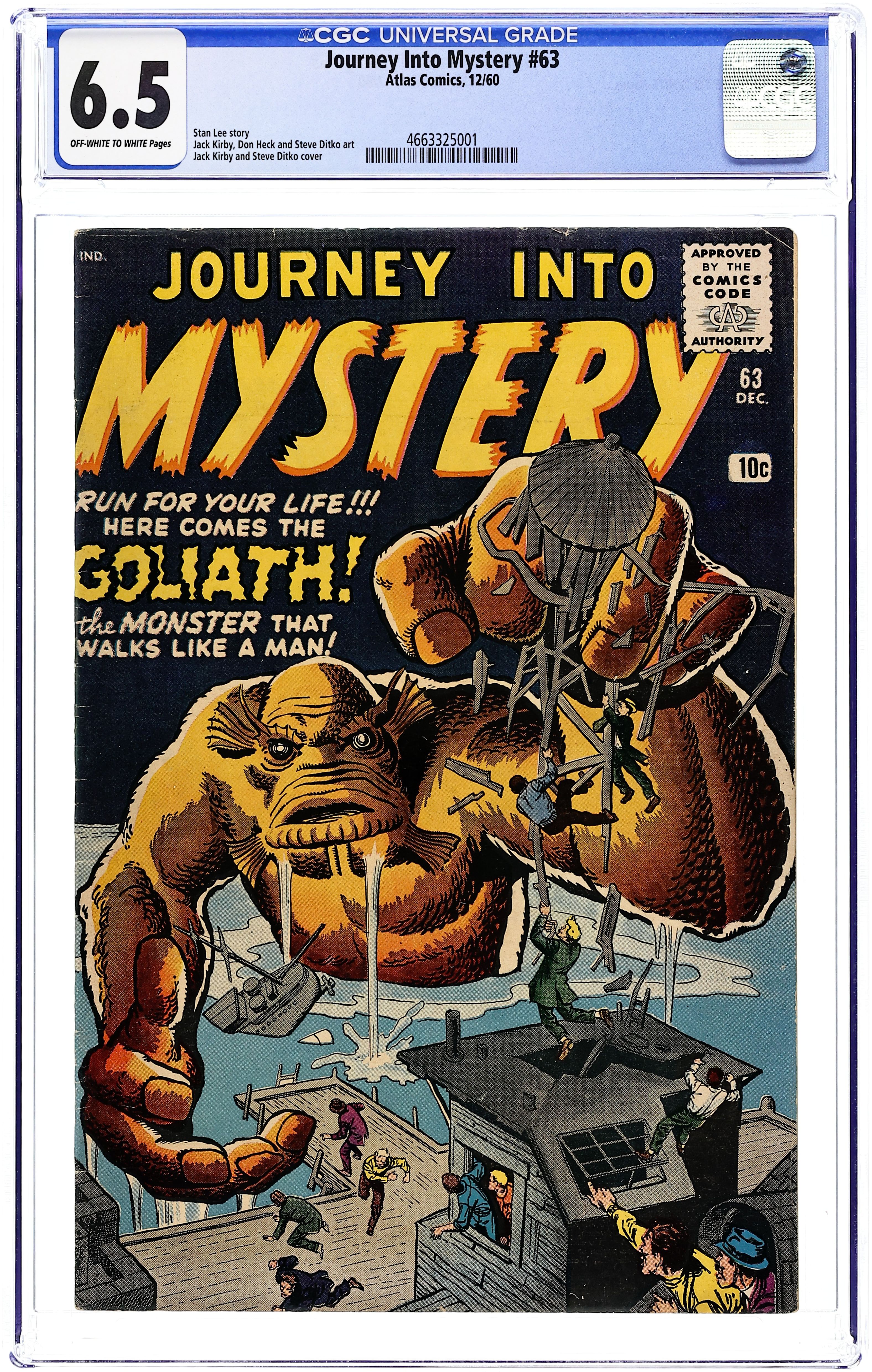 Cover pencils by Jack Kirby, inks by Steve Ditko. "Goliath! The Monster That...Walked Like a Man!," pencils by Jack Kirby, inks by Steve Ditko; An advertising man tricks an advance agent of a proposed invasion from Atlantis into returning to Atlantis by building a mannequin even larger than Goliath and threatening to wage war with his people for the surface of Earth. "The Heat's On" text story, art by Gene Colan and Don Heck. "I Was Trapped by the Mole Men!," art by Don Heck; A snobbish mine owner is captured by subterranean creatures and kept in a zoo until the mine foreman rescues him. "The Dangerous Doll," pencils by Jack Kirby; A poor man finds a doll in the field and gives it to his lame daughter. "I Took a Journey Into Fear!," art by Steve Ditko; A man wants to build a time machine, but his colleagues say it is impossible. 36 pgs., full color. $0.10. Cover price $0.10.