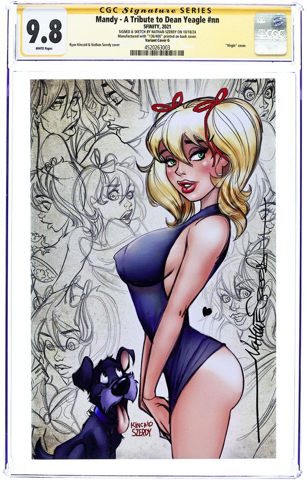 Variant Cover G by Ryan Kincaid and Nathan Szerdy - limited to 400 copies. A Mandy tribute to Dean Yeagle with over 20 new pin-ups and variant covers by some of the hottest pin-up artists in the industry! - Kickstarter page. Pinups by Dean Yeagle, Ryan Kincaid & Nathan Szerdy, Glen Fernandez, Ana Sanchez, Pasquale Qualano & Rusty Gilligan, Monte Moore, Bill Maus, Patrick Finch, Andrew fielder, Jerry Carr, Pedro Perez, George Webber, Roger Andrews & Tom Chu/Ashilianna Felix, Nathan Szerdy, Shawn Van Briesen & Dean Yeagle, Mike DeBalfo & Ula Moss, Huy Truong, Ben Tan, and DLO.