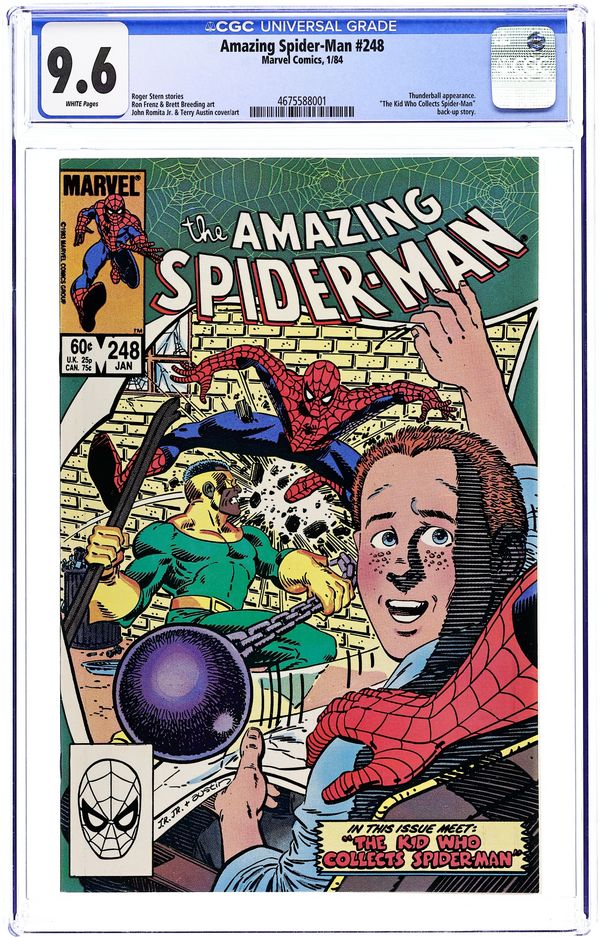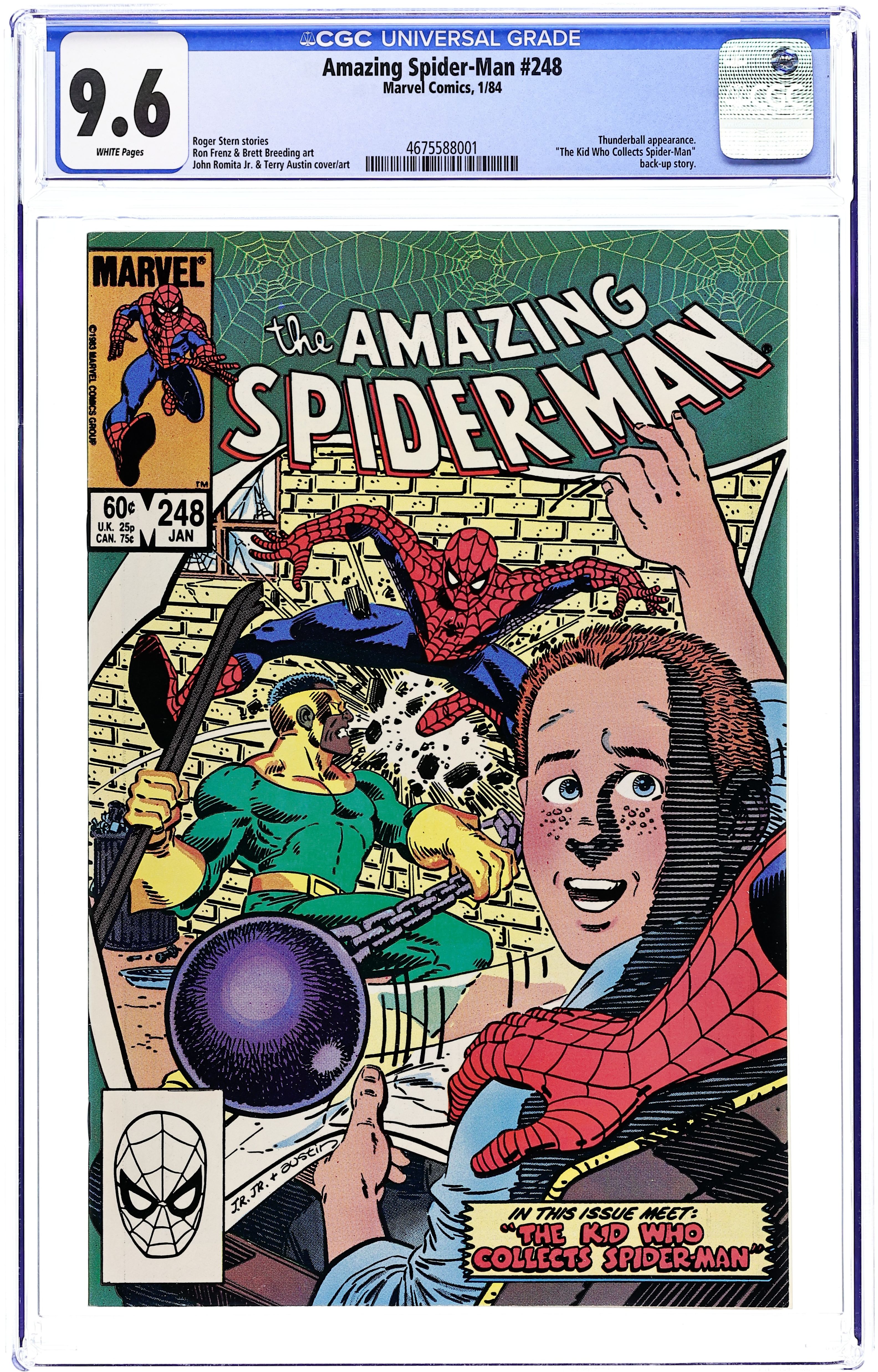 Direct Edition. "And He Strikes Like a Thunderball" Part 2 of 2. Script by Roger Stern. Art by John Romita Jr. (breakdowns) and Brett Breeding (finishes). Cover by John Romita Jr. and Terry Austin. Much to his chagrin, the web-slinger's journey to Long Island has not uncovered the Hobgoblin; instead, an Asgardian-powered super-villain! Thunderball! Wow, one of the members on the Wrecking Crew! With the Wrecker's crowbar and his own ball & chain, the mighty Thunderball takes dead aim on the wall-crawler! But the quick-thinking Spider-Man jumps inside a LILCO substation and sets a high voltage trap! Can the web-slinger give Thunderball the shock of his life? Second story: "The Kid Who Collects Spider-Man!" Script by Roger Stern. Art by Ron Frenz (breakdowns) and Terry Austin (finishes). One of the most cherished stories in the annals of the Amazing Spider-Man! The web-slinger visits a terminally ill leukemia patient to make his wish come true! Brief retelling of Spider-Man's origin. Flashback cameos by Aunt May and Uncle Ben. (Notes: Thunderball previously appeared in Iron Man 171. The second story was reprinted in 1994 in the trade paperback: The Very Best of Spider-Man.) 36 pgs. Cover price $0.60.