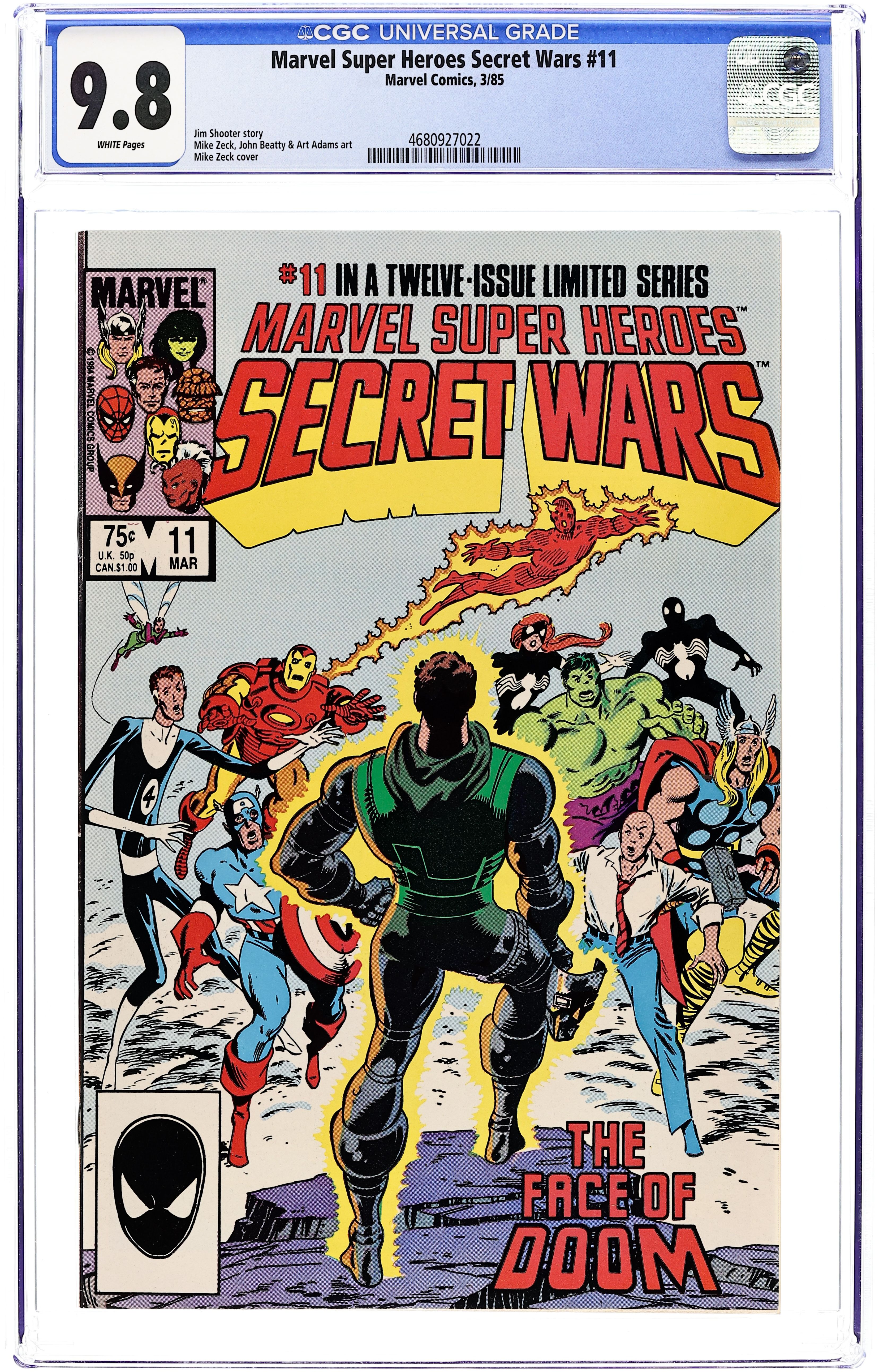 Direct Edition. "...Nothing to Fear...!" Part 12 of 12. Story by Jim Shooter. Art by Mike Zeck and John Beatty. Plus: Mike Mignola and Art Adams (some inks). This is it, the explosive conclusion to the most epic adventure of all. The Marvel heroes rally behind Captain America and confront a cosmically empowered Doctor Doom in a final showdown that will change everything. The end of this epic story has great ramifications throughout the Marvel Universe. Plot threads from this issue continue in Thing #11, Fantastic Four #265, Amazing Spider-Man #252, Avengers #243, and Secret Wars II #1. 36 pages, full color. Cover price $1.00.