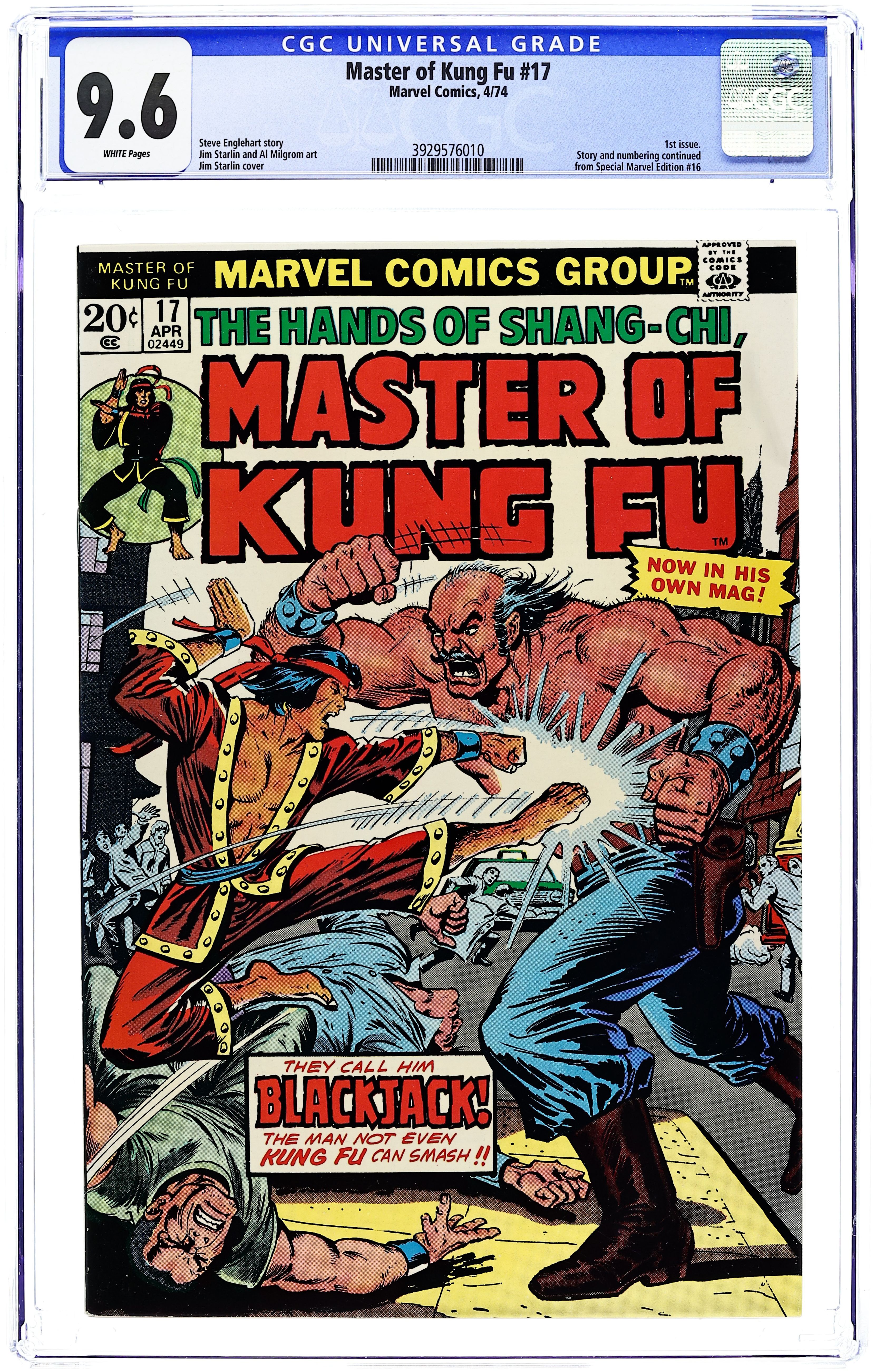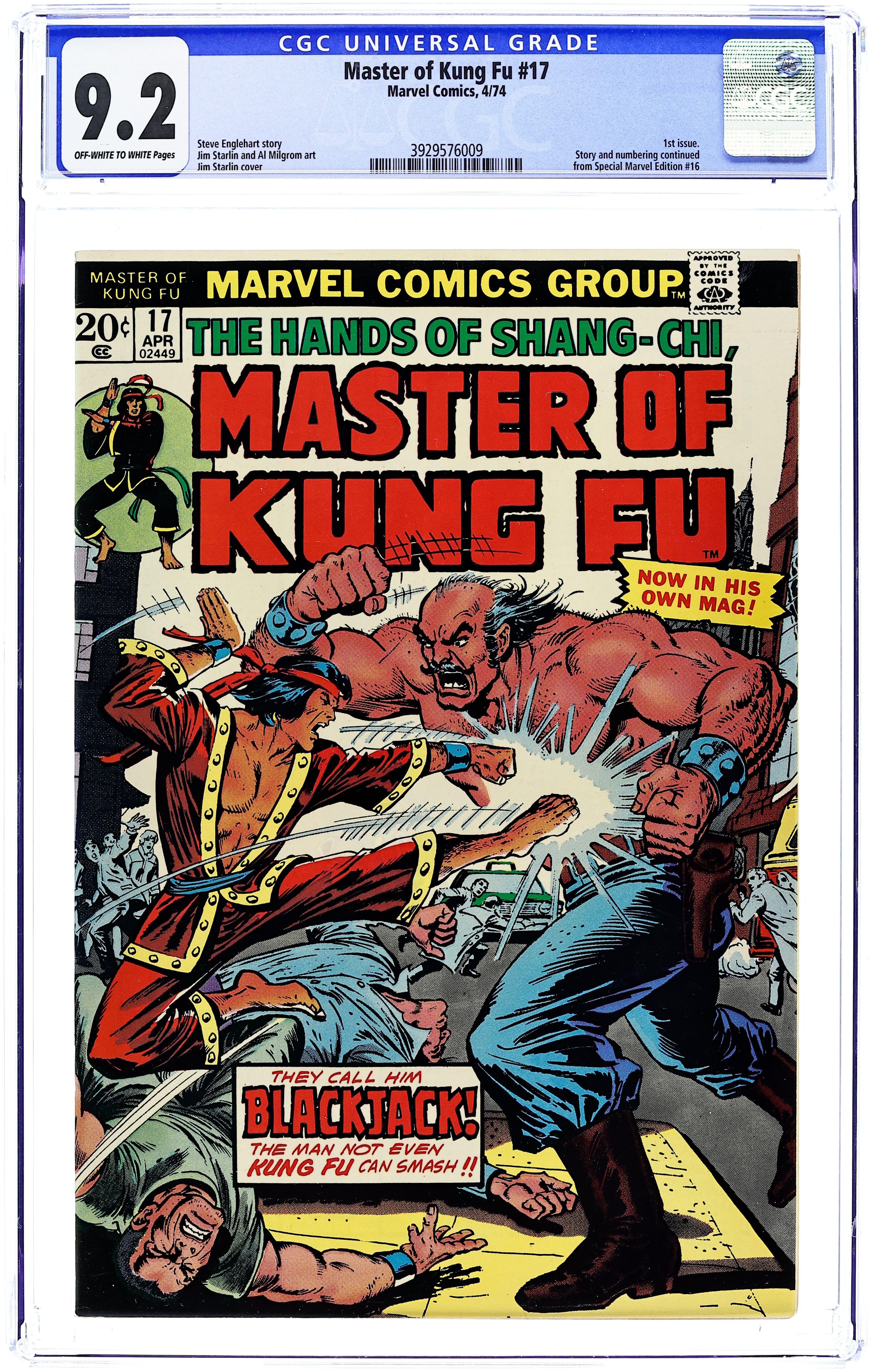 First issue of the series (continues from Special Marvel Edition). "Lair of the Lost!" Script by Steve Englehart, pencils by Jim Starlin, inks by Al Milgrom. What good is it being the Master of Kung Fu if you are facing Blackjack, the man not even Kung Fu can smash? The letters page includes the Marvel Value Stamp series A # 53 (The Grim Reaper). Cover price $0.25.