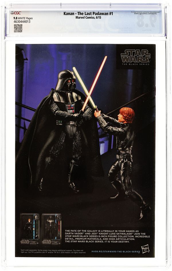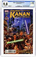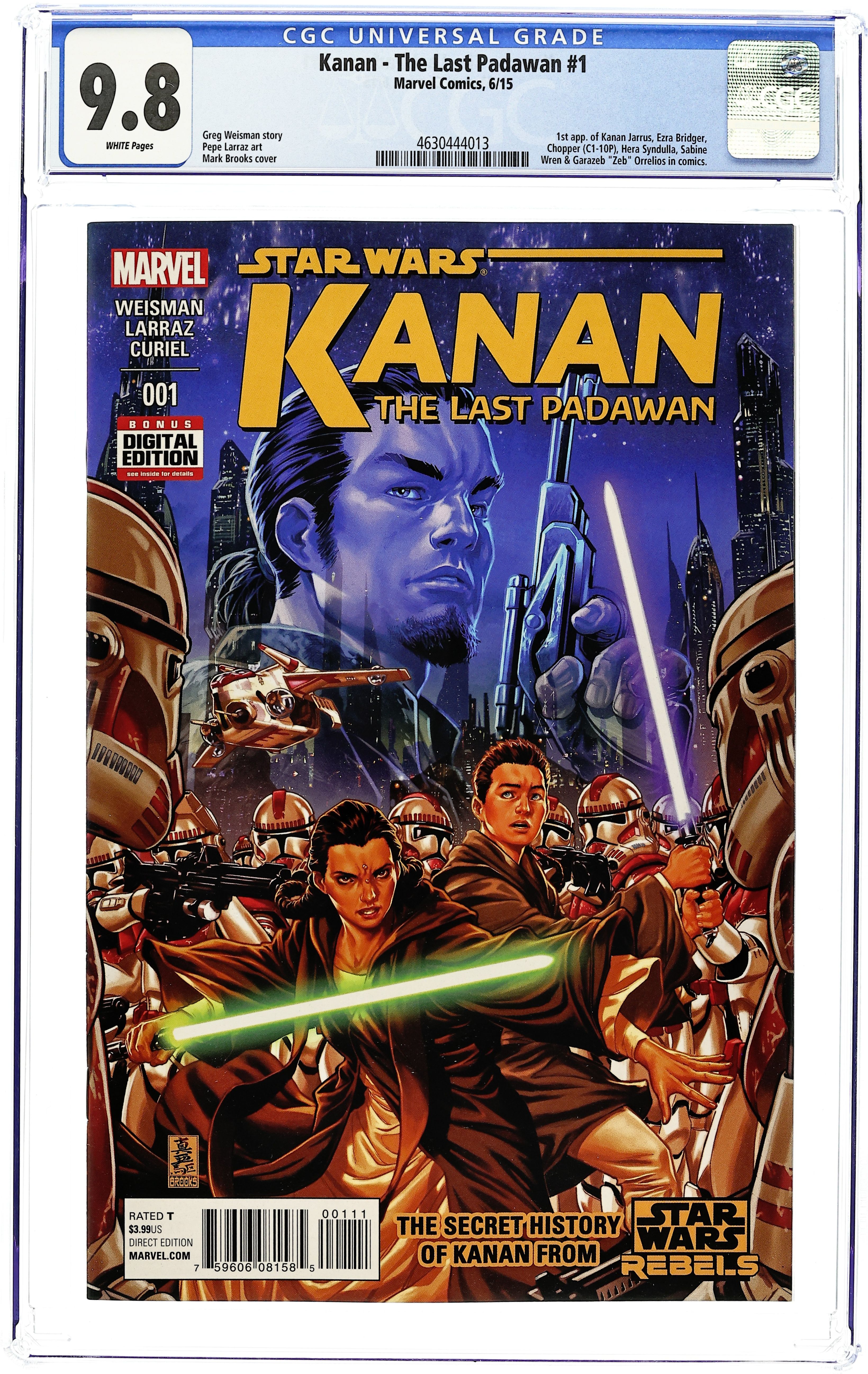 Written by Greg Weisman. Art by Pepe Larraz. Cover by Mark Brooks. Kanan Jarrus--in STAR WARS REBELS, he's a cocky, sarcastic renegade fighting against the Galactic Empire alongside the rag-tag crew of the Ghost...but years before, at the height of the Clone Wars, he was known as Caleb Dume, Jedi Padawan under the instruction of Jedi Master Depa Billaba. Neither master nor apprentice ever suspected that the Clone Troopers they commanded would turn on them upon the issuing of Order 66-the order to execute all Jedi. How did Caleb Dume survive? How did he learn to survive on his own? And how did he become the man we know as Kanan Jarrus? A tale bridging the years between the Clone Wars and Rebels! 28 pages, full color. Rated T. Star Wars Lucasfilm Ltd. & TM. All rights reserved. Used under authorization. Text and illustrations for Star Wars are 2015 Lucasfilm Ltd. Cover price $3.99.