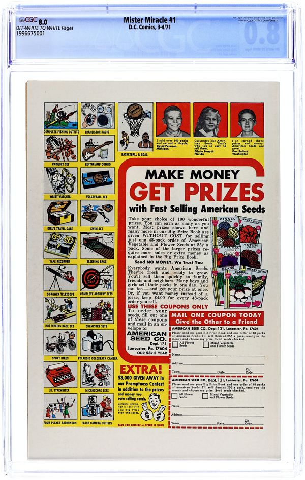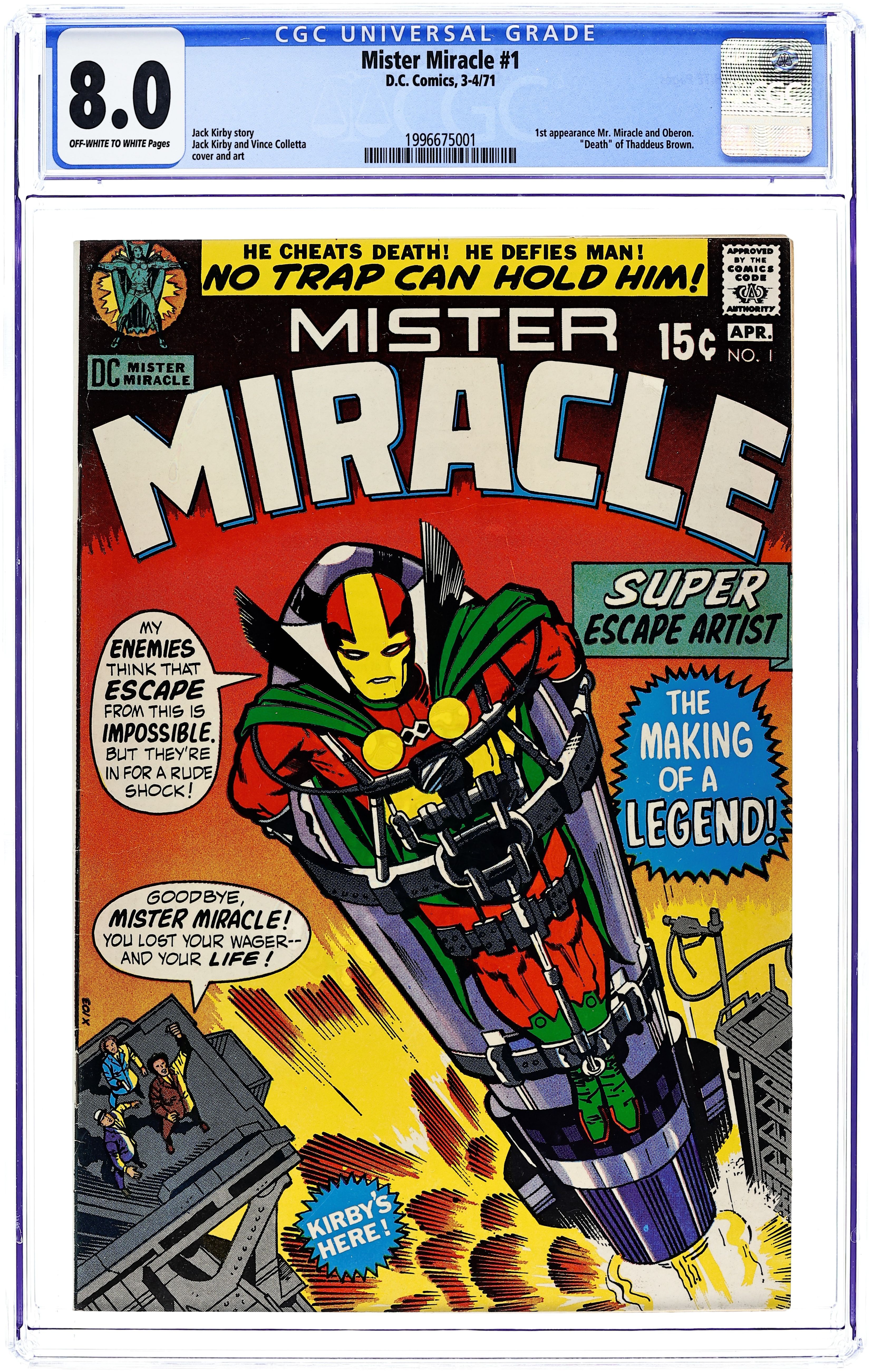 "Murder Missile Trap." Elite soldier Scott Free escapes Apokolips and comes to Earth, where he assumes the role of Mister Miracle. Inspired by the real world exploits of Jim Steranko, who was a magician and escape artist prior to his career in comics, Mister Miracle was created by the great Jack Kirby for his epic Fourth World saga. Script, pencils, and cover by Jack Kirby. Inks by Vince Colletta. Cover price $0.15.