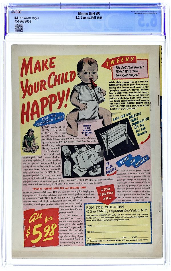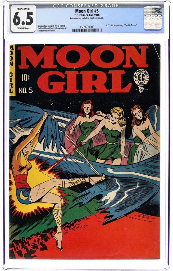 Cover by Johnny Craig, his first published work for EC. Origin of Moon Girl (see also Happy Houlihans # 1). Moon Girl stories also include "Invaders From Venus," "Prince Mengu and Moon Girl Versus Satana, Queen of the Underworld" (first appearance), and "Smuggler's Cove!" Sheldon Moldoff art. 44 pages. Cover price $0.10.