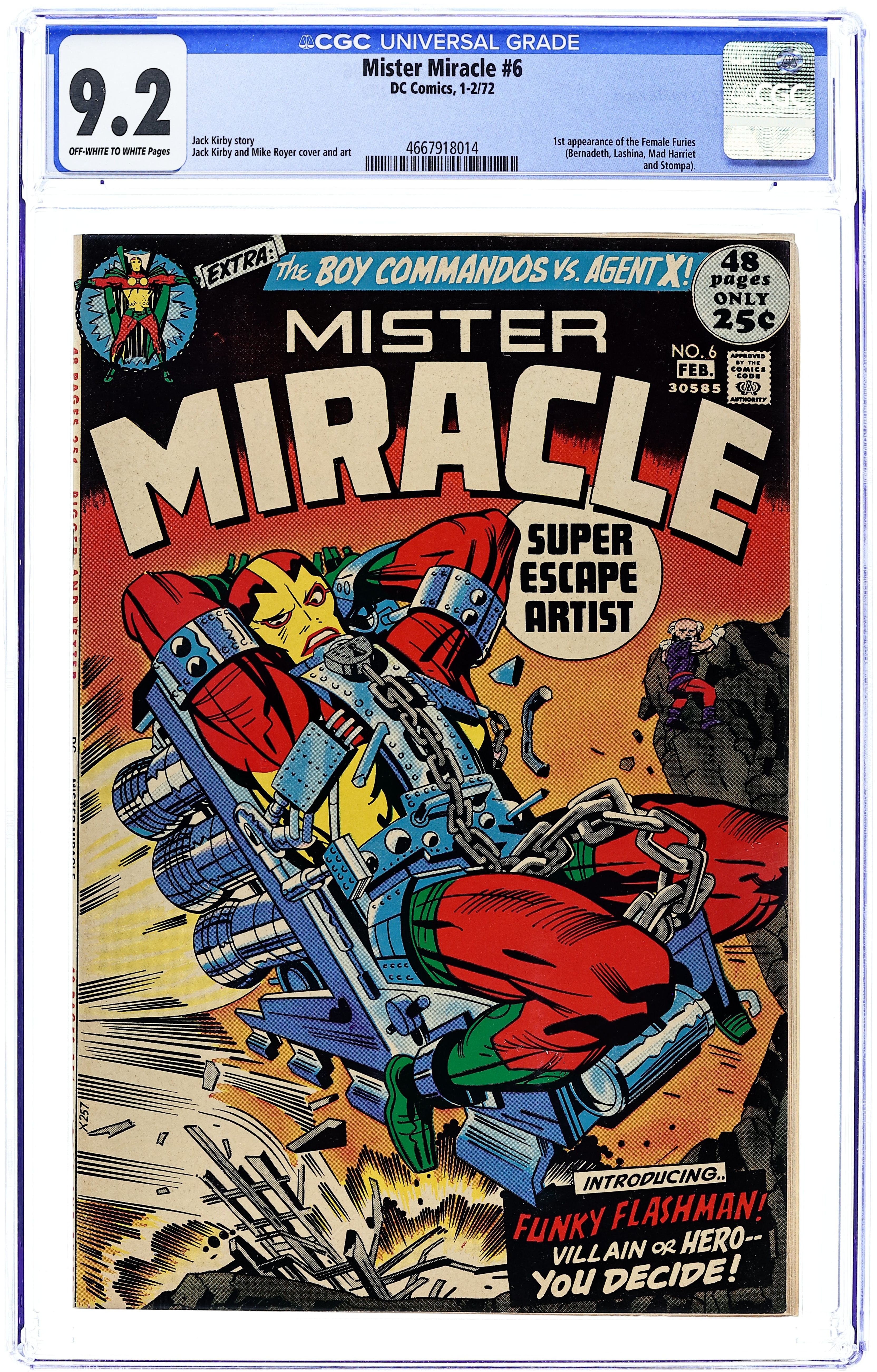 "The Closing Jaws of Death." Yet another action packed, whiz bang adventure, this issue finds Mister Miracle trying to escape from a trap by Dr. Bedlam. Features the first appearance of Big Barda. Back-up Boy Commandos reprints begin in this issue. Script, pencils, and cover by Jack Kirby. Inks by Vince Colletta. Cover price $0.25.