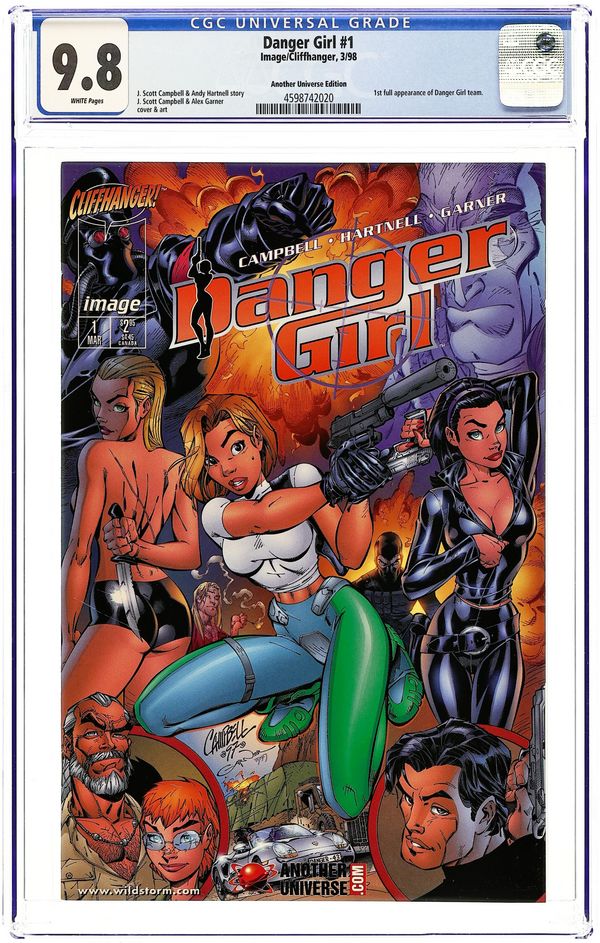 Another Universe Variant Cover. Cover pencils by J. Scott Campbell, inks by Alex Garner. "Dangerously Yours," script by J. Scott Campbell (plot) and Andy Hartnell (script), pencils by J. Scott Campbell, inks by Alex Garner; Abbey Chase chases after Donavin in a "borrowed" jeep; Danger Girls are right behind, hot on the trail of Abbey; Abbey stops Donavin and reclaims a priceless skull from him; Abbey joins Operation Danger Girl. March Releases & Danger Girl Tour 1998 ad. 44 pgs., full color. Cover price $2.95.
