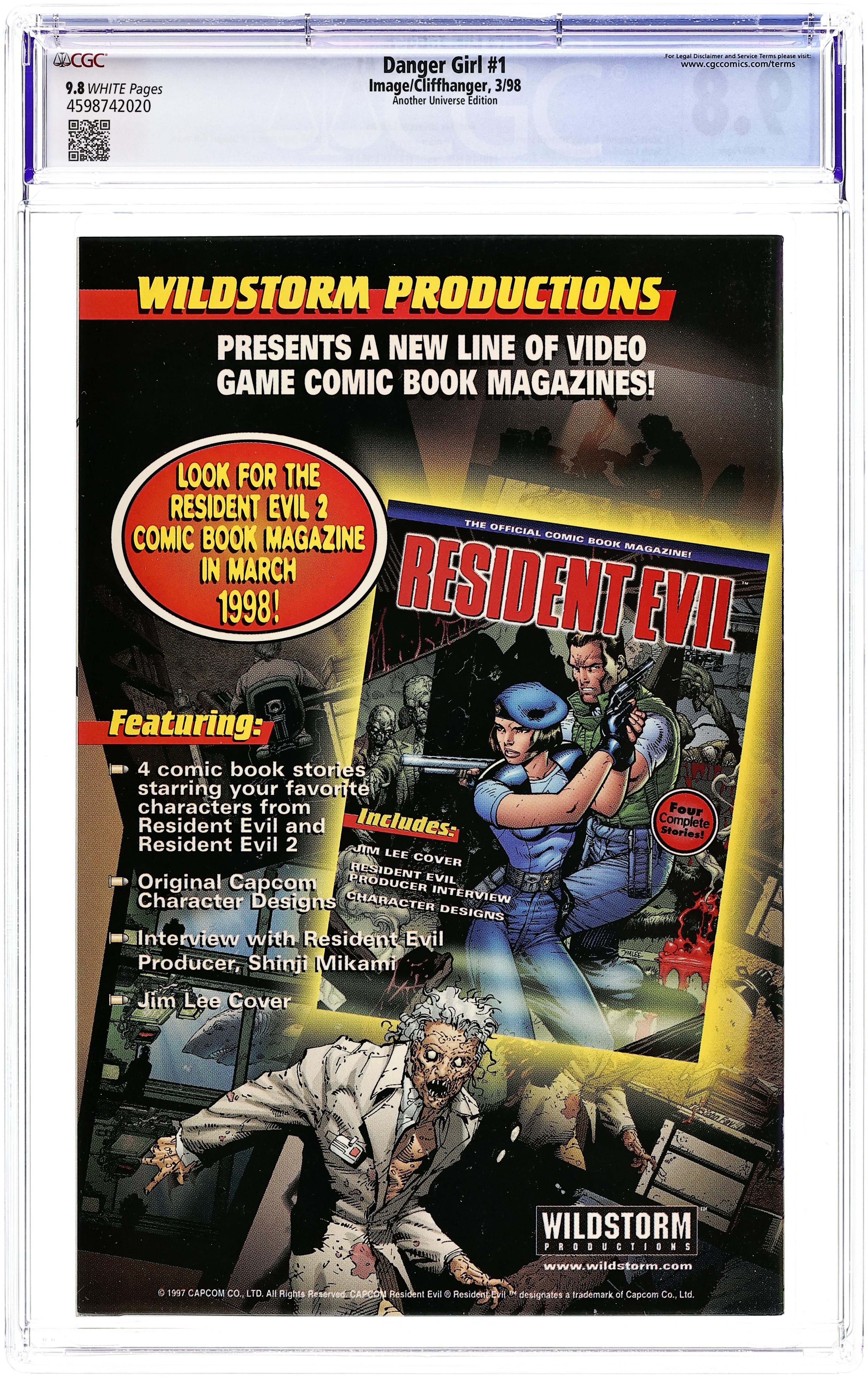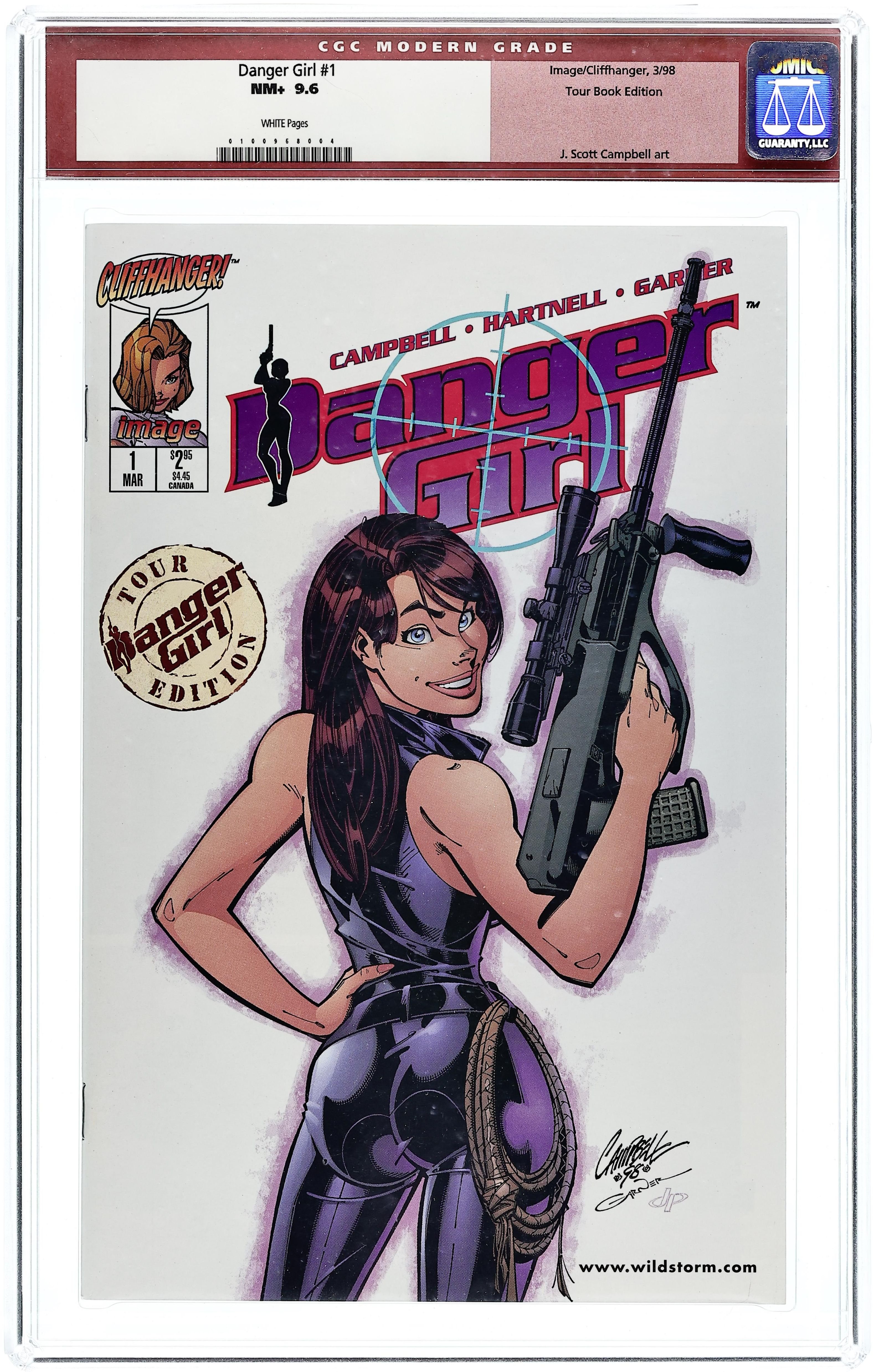 This special Tour Edition was limited to 500 copies. Cover pencils by J. Scott Campbell, inks by Alex Garner. "Dangerously Yours," script by J. Scott Campbell (plot) and Andy Hartnell (script), pencils by J. Scott Campbell, inks by Alex Garner; Abbey Chase chases after Donavin in a "borrowed" jeep; Danger Girls are right behind, hot on the trail of Abbey; Abbey stops Donavin and reclaims a priceless skull from him; Abbey joins Operation Danger Girl. March Releases & Danger Girl Tour 1998 ad. 44 pgs., full color. Cover price $2.95.