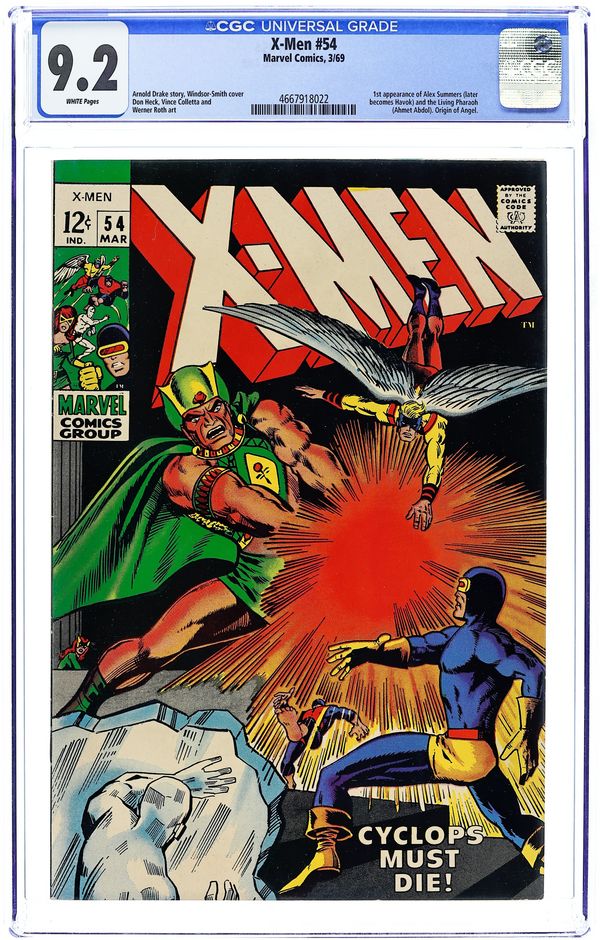 First appearances of Alex Summers (later Havok) and the Living Pharaoh. Cover pencils by Barry Windsor-Smith [as Barry Smith] and John Romita (on Living Pharaoh figure), inks by Vince Colletta. Wanted: Dead Or Alive--Cyclops!, script by Arnold Drake, pencils by Don Heck and Werner Roth, inks by Vince Colletta; the X-Men battle Ahmet "The Living Pharaoh" Abdol, who has captured Cyclops' younger brother, Alex; two cops try to arrest Cyclops for the murder of Abdol. The Million Dollar Angel--The Origins of the Uncanny X-Men, script by Arnold Drake, pencils by Werner Roth, inks by Vince Colletta; Angel's origin. A letter from comics professional Bob Wiacek. This issue contains a statement of ownership--average print run 415,200; average paid circulation 273,360. 36 pgs. $0.12. Cover price $0.12.