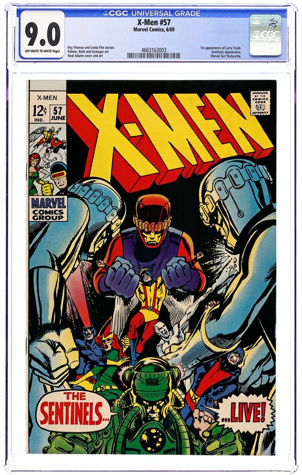 First appearance of Larry Trask. Cover pencils by Neal Adams, inks by Tom Palmer. The Sentinels Live!, script by Roy Thomas, pencils by Neal Adams, inks by Tom Palmer; Lorna is attacked by a Sentinel; Alex is paralyzed by his terrible and destructive new powers as the X-Men try to figure out how to help him; The Egyptian authorities arrive and the Living Pharaoh tells them to arrest the X-Men for the destruction of an ancient temple; Alex takes off in the conflict and is attacked by a Sentinel; Learning of the attack on Lorna, Iceman and Beast head back to the states to investigate; They catch a newscast where the son of Bolivar Trask proclaims to the world that the Sentinels are once again active and hunting for mutants. The Female of the Species!--The Origins of the Uncanny X-Men, script by Linda Fite, pencils by Werner Roth, inks by Sam Grainger; explanation of Marvel Girl's powers. 36 pgs. $0.12. Cover price $0.12.