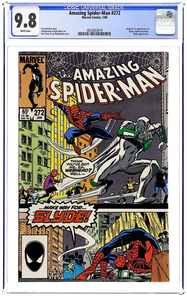 Direct Edition. "Make Way for Slyde!" Script by Tom DeFalco. Pencils by Sal Buscema. Inks by Kyle Baker. Cover by Ron Frenz and Joe Rubinstein. A new sleek and savvy super-villain bursts onto the scene! Slyde! And this guy is slipperier than a greased pig! When the teflon-coated speedster robs a bank, he garners the attention of the wondrous wall-crawler! But even Spidey can't lay a glove on him! Can anyone stop (the) Slyde? First appearance and origin of Slyde. Cameo appearance by Puma. Last 65¢ issue. (Notes: Slyde returns in Web of Spider-Man 23. Kyle Baker's inks over Sal Buscema's pencils create a very distinctive look. This story was reprinted in Marvel Tales 282.) 36 pages. Cover price $0.65.