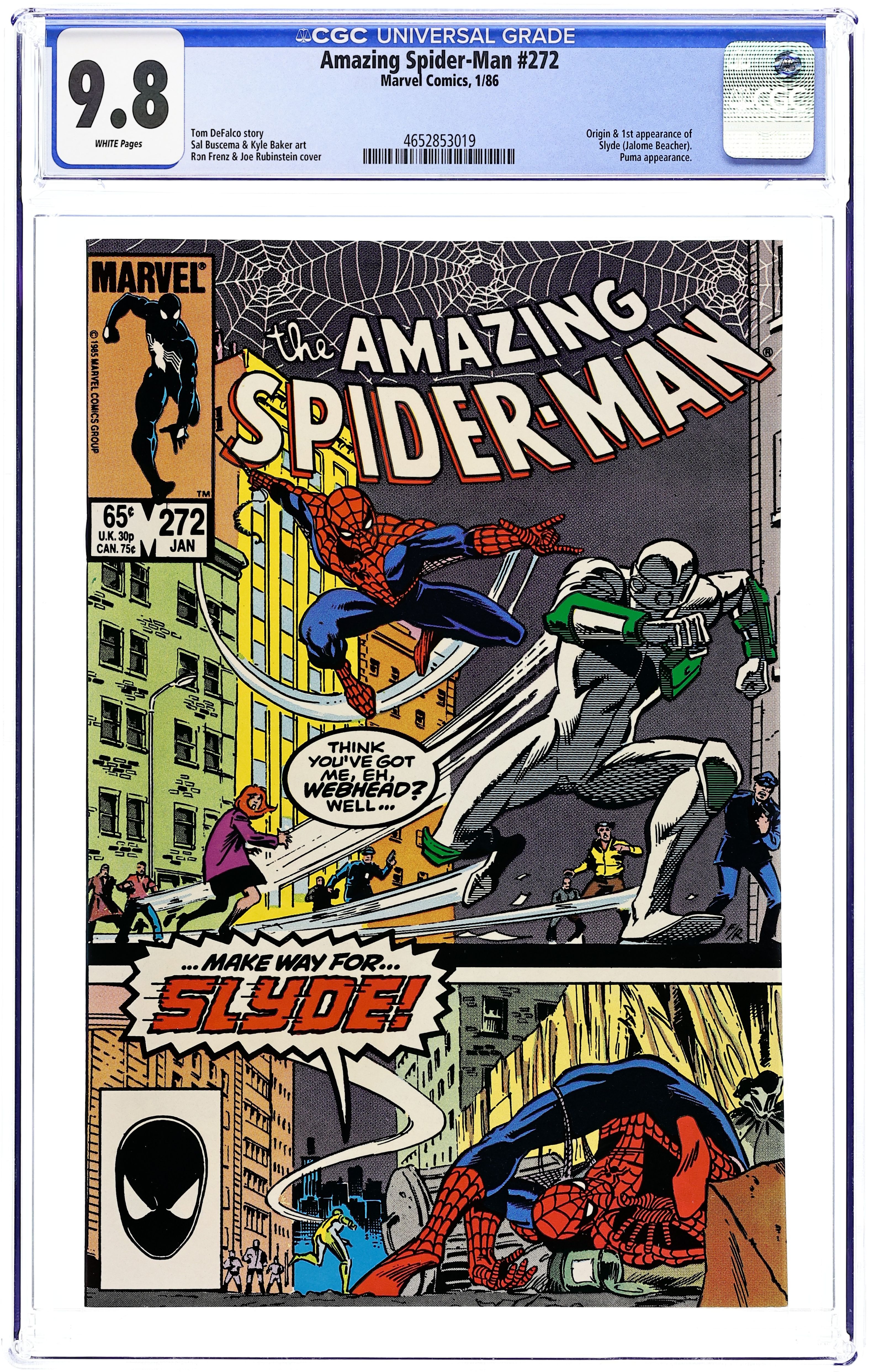 Newsstand Edition. "Make Way for Slyde!" Script by Tom DeFalco. Pencils by Sal Buscema. Inks by Kyle Baker. Cover by Ron Frenz and Joe Rubinstein. A new sleek and savvy super-villain bursts onto the scene! Slyde! And this guy is slipperier than a greased pig! When the teflon-coated speedster robs a bank, he garners the attention of the wondrous wall-crawler! But even Spidey can't lay a glove on him! Can anyone stop (the) Slyde? First appearance and origin of Slyde. Cameo appearance by Puma. Last 65¢ issue. (Notes: Slyde returns in Web of Spider-Man 23. Kyle Baker's inks over Sal Buscema's pencils create a very distinctive look. This story was reprinted in Marvel Tales 282.) 36 pages. Cover price $0.65.