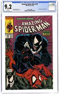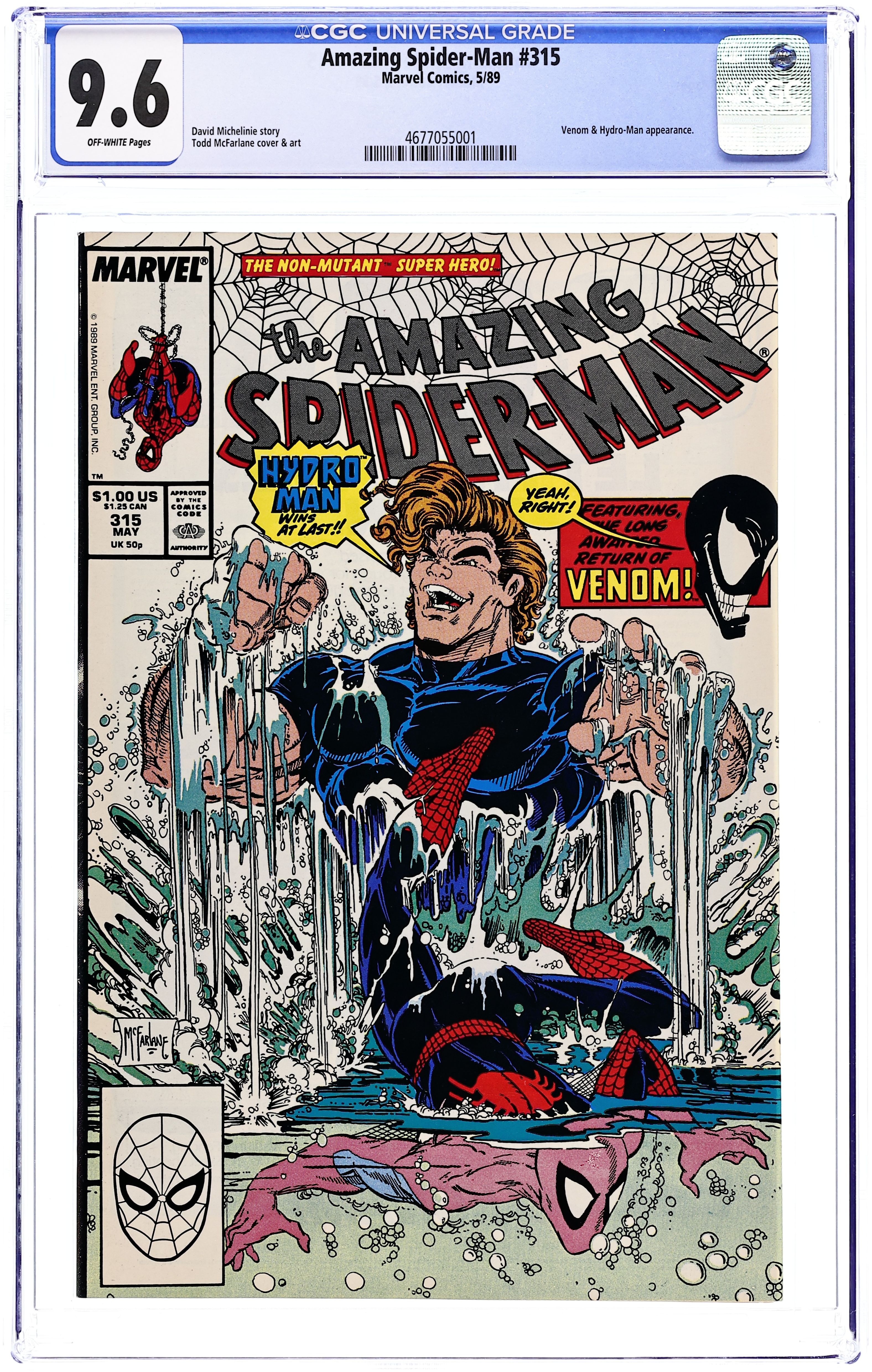 Direct Edition. "A Matter of Life and Debt!" Script by David Michelinie. Art by Todd McFarlane. Cover by Todd McFarlane. Life is full of challenges and on this day Peter Parker and his web-spinning alter-ego face three! The first, Hydro-Man attempts a payday robbery! But the Spectacular Spider-Man stops the heist! The second, Nathan Lubensky steals money from Aunt May to pay his gambling debts! However, Peter quickly shuts down his operation! And the fateful third...Venom escapes from the Vault! Wow, this challenge will be more difficult and more deadly starting next issue! Cameo appearances by Mary Jane Watson and Kristy Watson. (Notes: Venom previously appeared in Amazing Spider-Man 300.) The letters page contains a statement of ownership: average print run 451,930; average paid circulation 271,100. 36 pgs. Cover price $1.00.