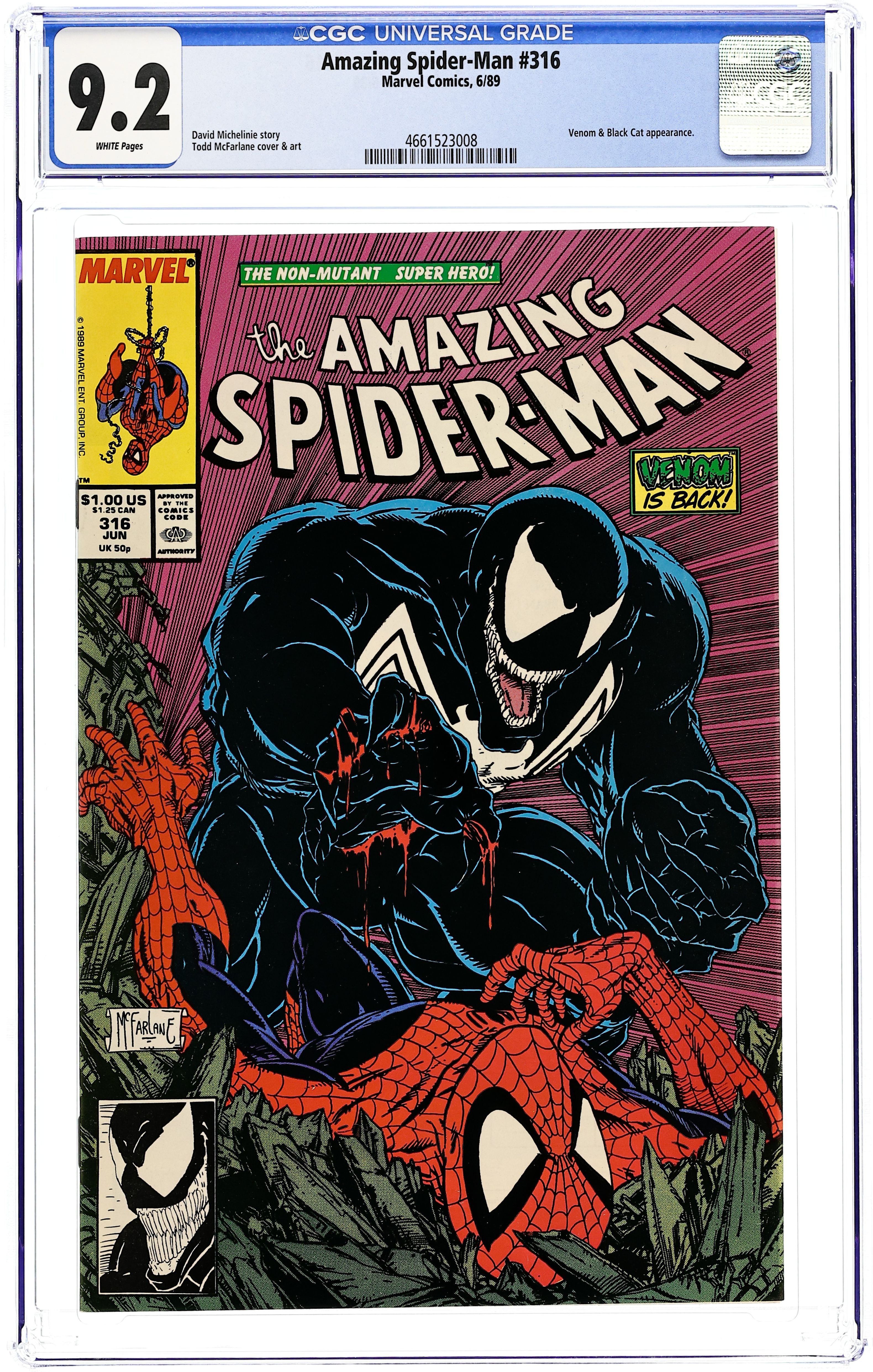 Direct Edition. "Dead Meat" Part 1 of 2. Script by David Michelinie. Art by Todd McFarlane. Cover by Todd McFarlane. Venom is back in New York City! And the deranged Eddie Brock is looking to kill Peter Parker or Spider-Man with extreme prejudice! However, first the psychotic symbiote has to find where the Parkers are living! At the web-slinger's former Bedford Towers residence, Venom runs into and then runs roughshod over the Black Cat! But Felicia doesn't know where the wall-crawler is either! Later on Peter learns that his worst nightmare has returned and his family is in grave danger. Spider-Man can't wait for Venom to make the first move. The web-slinger must attack! Cameo appearances by Aunt May, Glory Grant, and Eduardo Lobo. (Note: This two-part story was reprinted in 1990 in the trade paperback: Spider-Man vs. Venom.) 36 pages. Cover price $1.00.