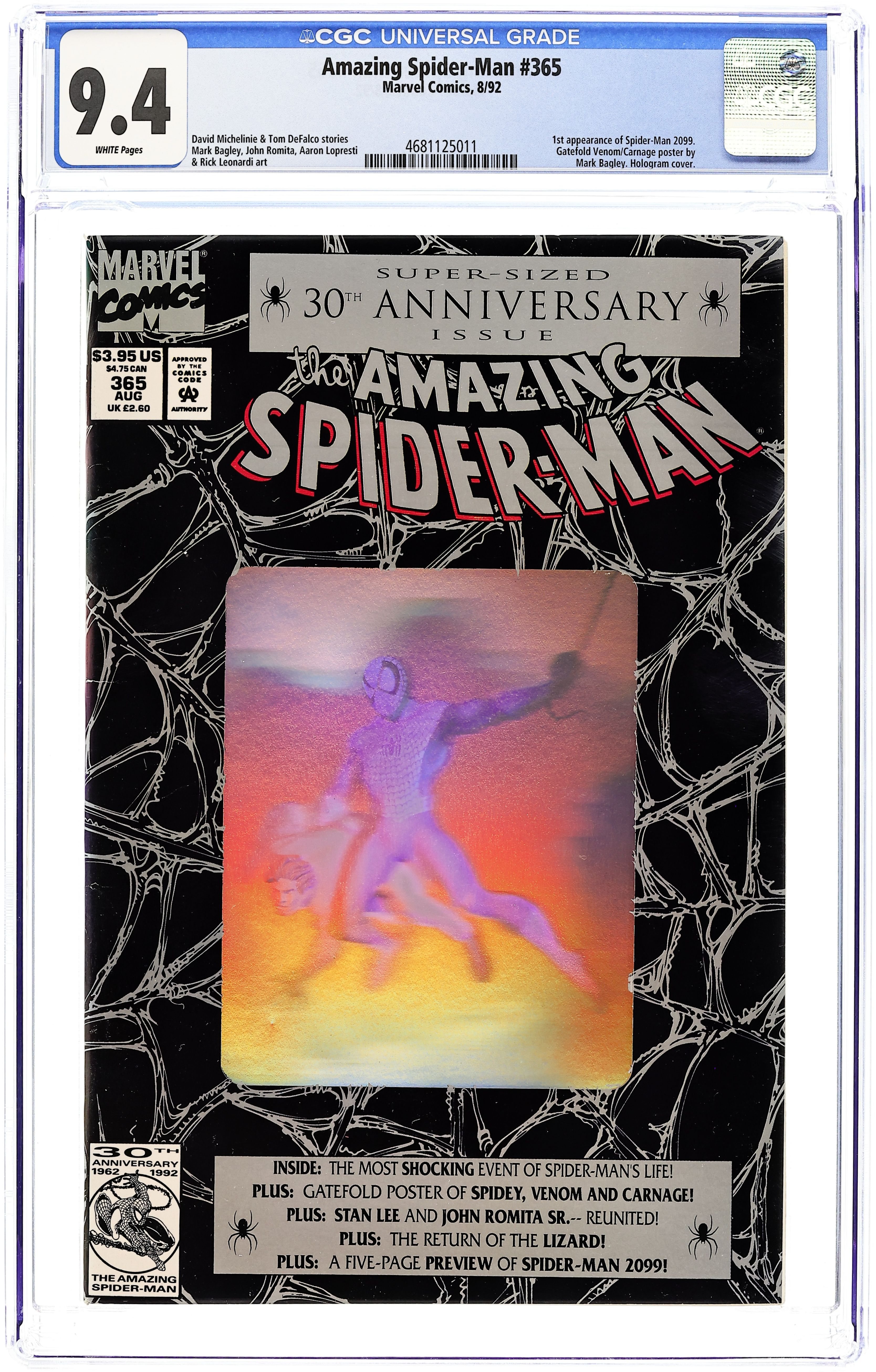 Direct Edition. 80-page giant 30th Anniversary issue, with the first appearance of Spider-Man 2099! The Lizard returns in "Fathers and Sins." Script by David Michelinie, pencils by Mark Bagley, inks by Randy Emberlin. J. Jonah Jameson is featured in "How I Created Spider-Man!" Script by David Michelinie, art by Aaron Lopresti. Gwen Stacy takes center stage in "I Remember Gwen." Script by Stan Lee, plot by Tom DeFalco, art by John Romita Sr. (Cameos by the Green Goblin and Doctor Octopus.) The Prowler is also here in "A Friend in Need." Script by Tom DeFalco, pencils by Tod Smith, inks by Andrew Pepoy. There are also two text pieces, "The Saga of Spidey's Parents" by Stan Lee, and "Spider-Man: The First Thirty Years" by Peter Sanderson. Spider-Man 2099 gets a sneak preview, with a script by Peter David, pencils by Rick Leonardi, and inks by Al Williamson. This issue was originally released with a fold-out poster of Spidey versus Venom and Carnage (poster may be missing in lower grades). 84 pgs. Cover price $3.95.