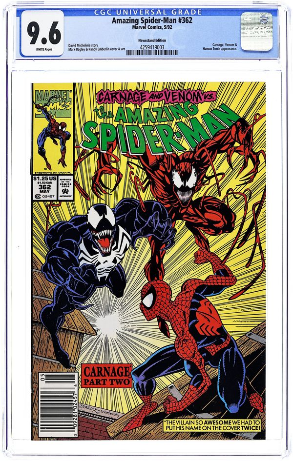 Tags: Marvel Legacy Numbering: Amazing Spider-Man (part 361), Spider-ManAmazing Spider-Man (1963 1st Series) 361A CGC 9.4 SS Bagley 1st Printing