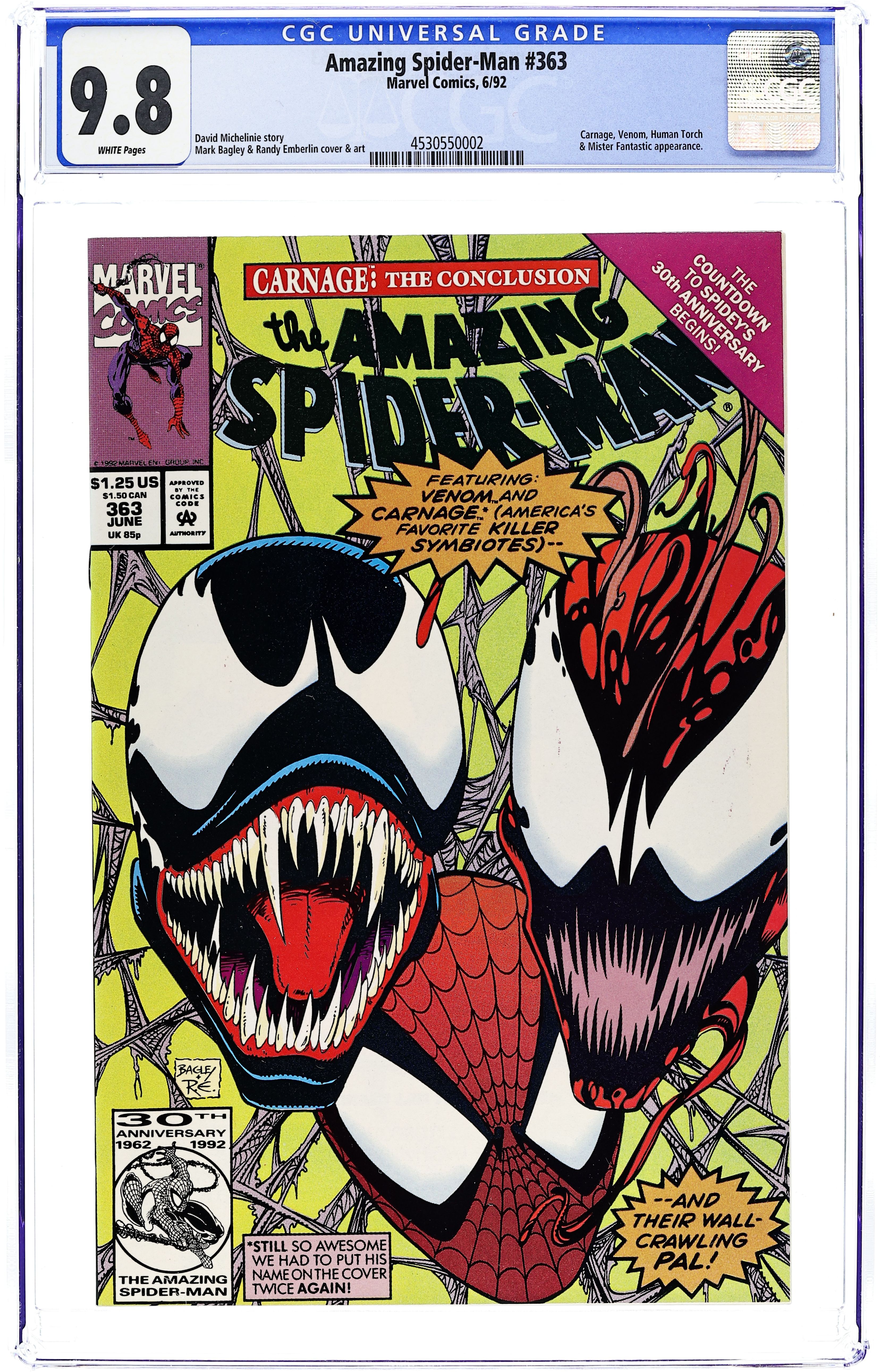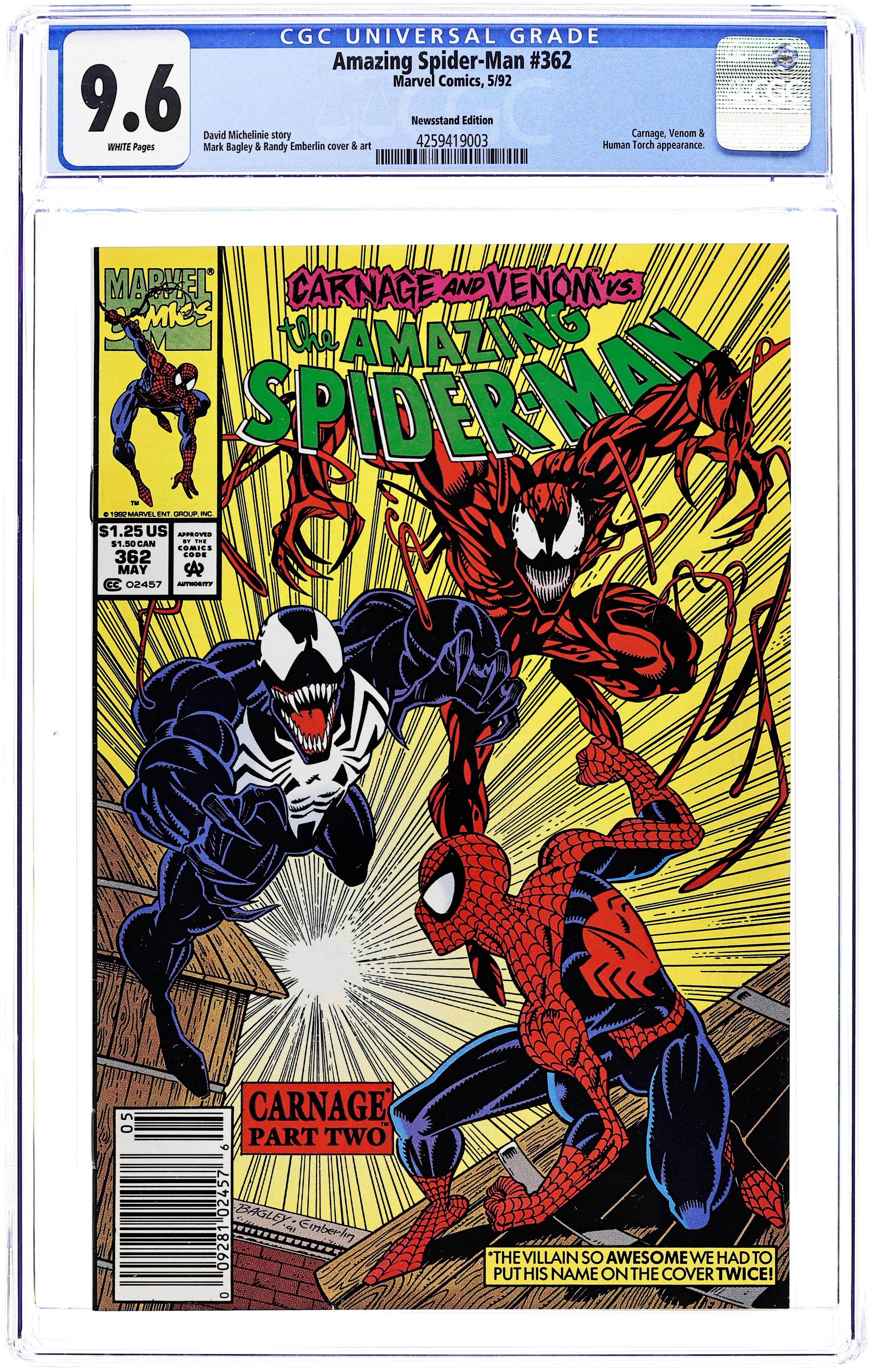 Direct Edition. "Savage Grace!" Part 3 of 3. Script by David Michelinie. Pencils by Mark Bagley. Inks by Randy Emberlin. Cover by Mark Bagley and Randy Emberlin. Carnage takes J. Jonah Jameson hostage and drags him to a heavy metal concert at Madison Square Garden! The psychotic killer plans to execute JJJ in front of thousands of headbangers! But before Carnage can deliver the deathblow, Spider-Man and Venom strike! The ferocious fight leads into the subway tunnels and then back onto the concert stage! Where thanks to MSG's awesome sound system, the web-slinger tries to knock out both Carnage and Venom! The wall-crawler's ploy better work, because double-crossing Venom could have lethal consequences! A fantastic finish! First appearances of the Richard Parker and Mary Parker life model decoys (LMD's). Cameo appearances by Joe Robertson, Mr. Fantastic, and the Human Torch. (Notes: Venom appears next in the one-shot: Spider-Man Special Edition -- The Trial of Venom (1992). Carnage returns in the first issue of Spider-Man Unlimited (1993 1st series) to kick off the Maximum Carnage saga.) 36 pages. $1.25 cover price. Cover price $1.25.