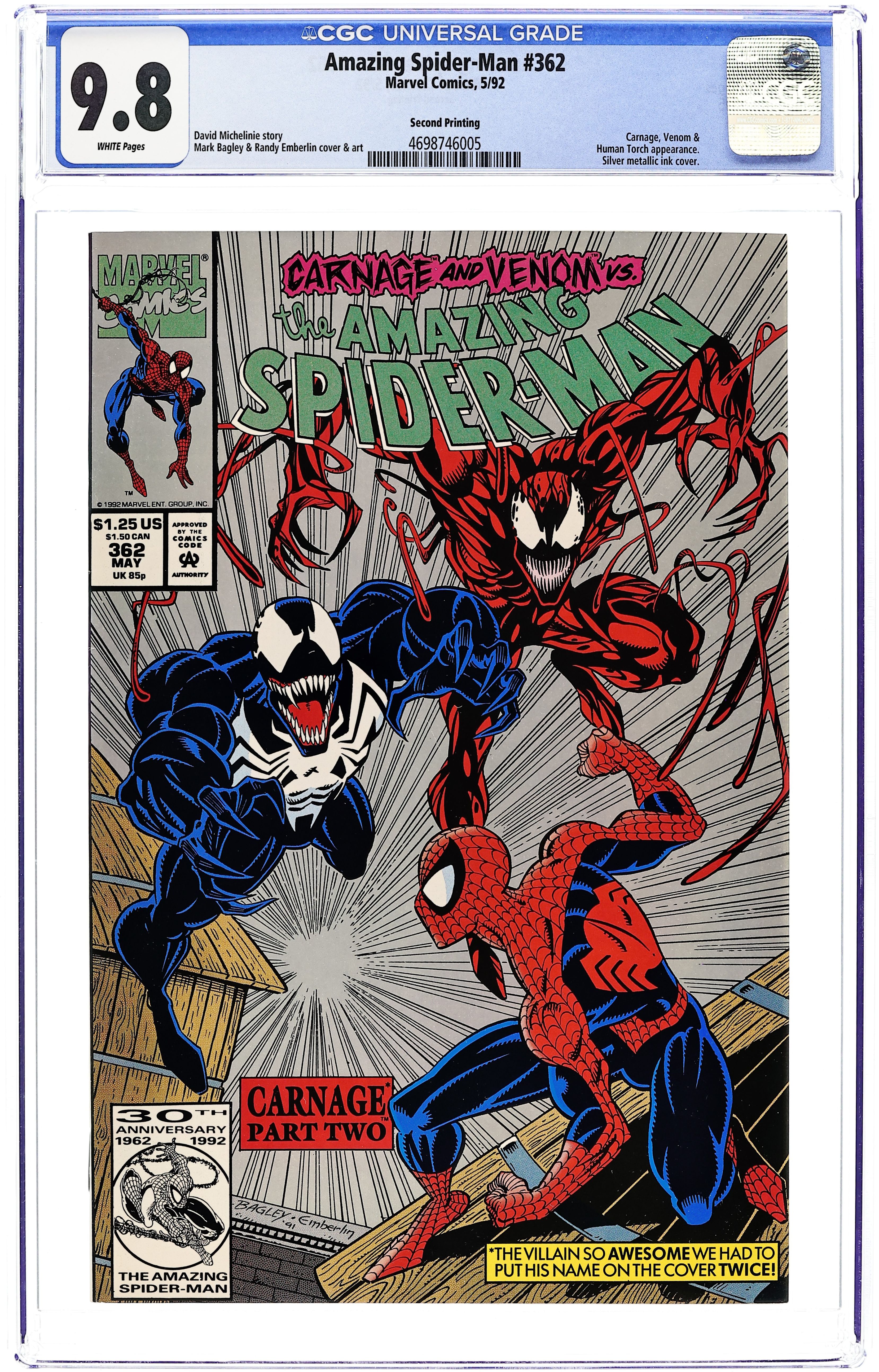 Second Printing (Silver Ink Background). 2nd appearance of Carnage. Venom appears. "Savage Alliance!" Part 2 of 3. Guest-starring the Human Torch. Script by David Michelinie. Pencils by Mark Bagley. Inks by Randy Emberlin. Cover by Mark Bagley and Randy Emberlin. After getting a taste of Carnage's raw power last issue, the wall-crawler knows he needs serious help! To that end the amazing one does the unthinkable! He pays a visit to Venom! Wow, is that a good idea? However as a precaution the web-slinger brings Johnny Storm along for the ride to Venom's deserted island! And following an intense battle, Venom surprisingly agrees to help his good pal Spidey! So in a truly unlikely pairing, the Spectacular Spider-Man and the Lethal Protector join forces to take down Carnage! You have to see it to believe it! Cameo appearance by J. Jonah Jameson. 36 pgs. Cover price $1.25.