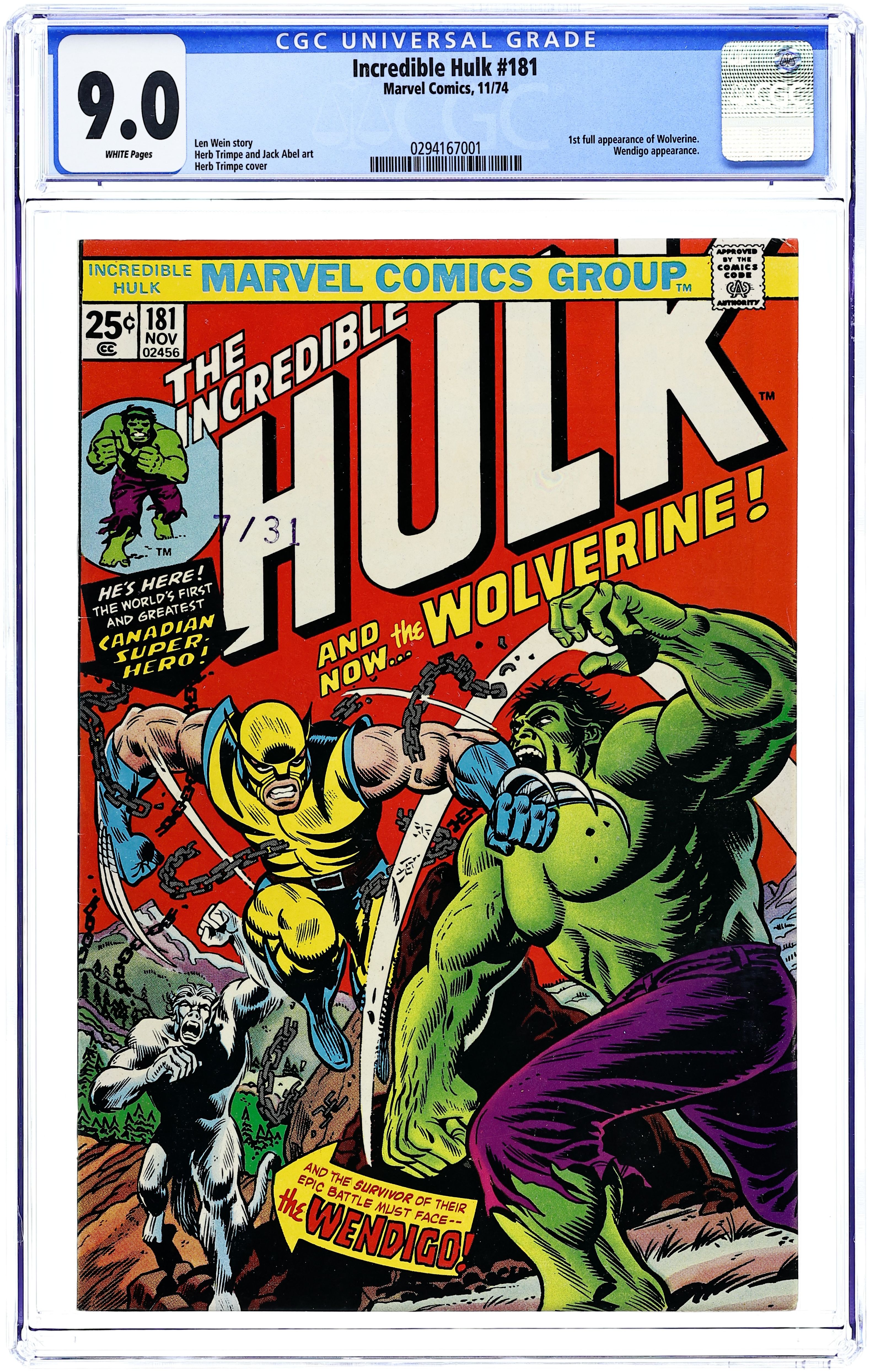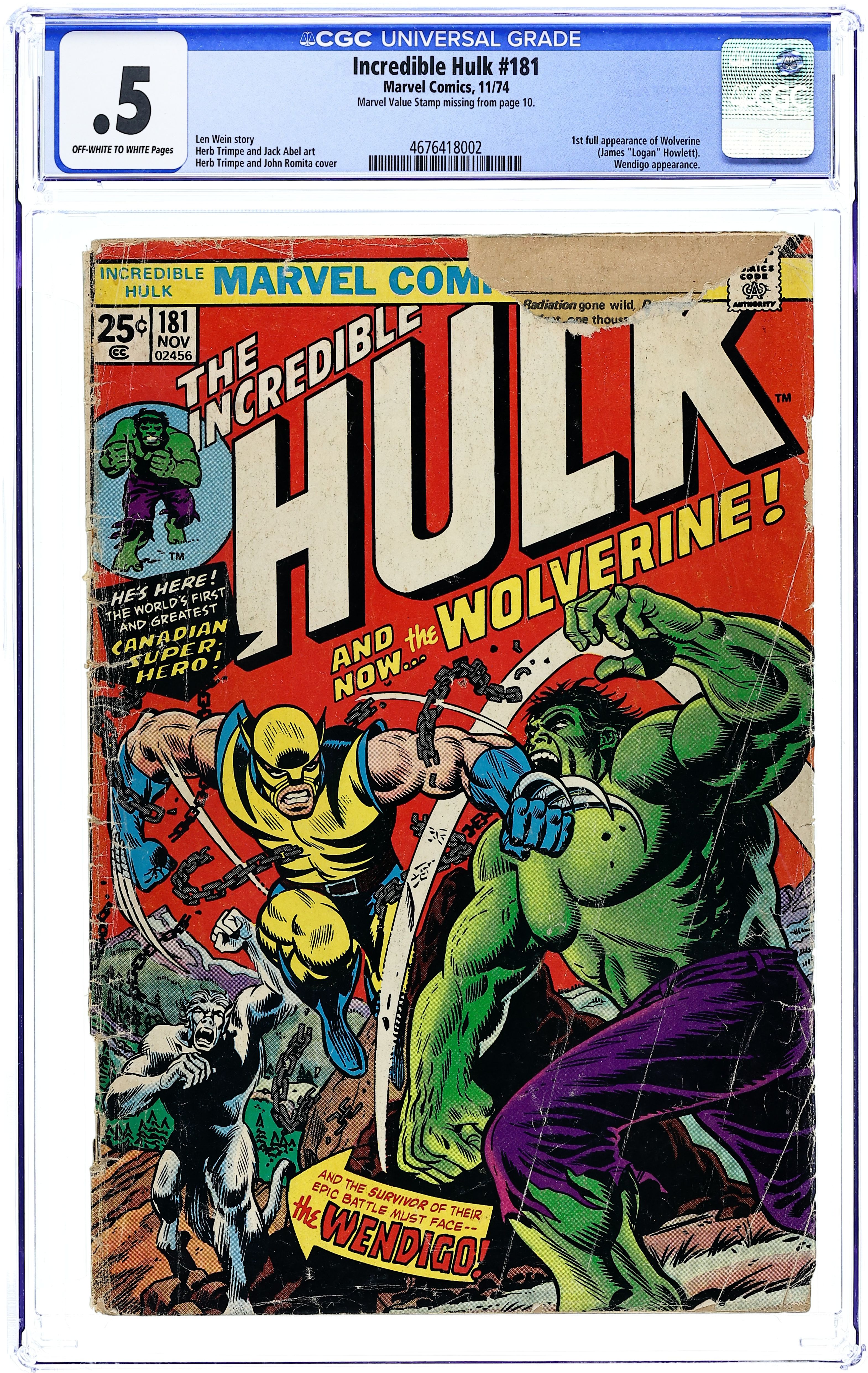First appearance of Wolverine (cameo last panel). Cover art by Herb Trimpe. And the Wind Howls...Wendigo!, script by Len Wein, pencils by Herb Trimpe, inks by Jack Abel; Hulk is in Canada looking for some peace and quiet when he is mysteriously drawn to a cave inhabited by the sister of the man who became the Wendigo; Marie and Georges plan on transferring the power of the Wendigo to the Hulk, thus restorin Paul Cartier to his normal life; Marie's magic isn't strong enough, however, and just as Wendigo shows up, the Hulk wakes up from his magical slumber and the two battle; The Canadian government gets involved and sends in their own agent to take care of a recent Hulk sighting, the mutant known as Wolverine. Marvel Value Stamp Series A (Cyclops). 36 pgs. $0.25. Cover price $0.25.