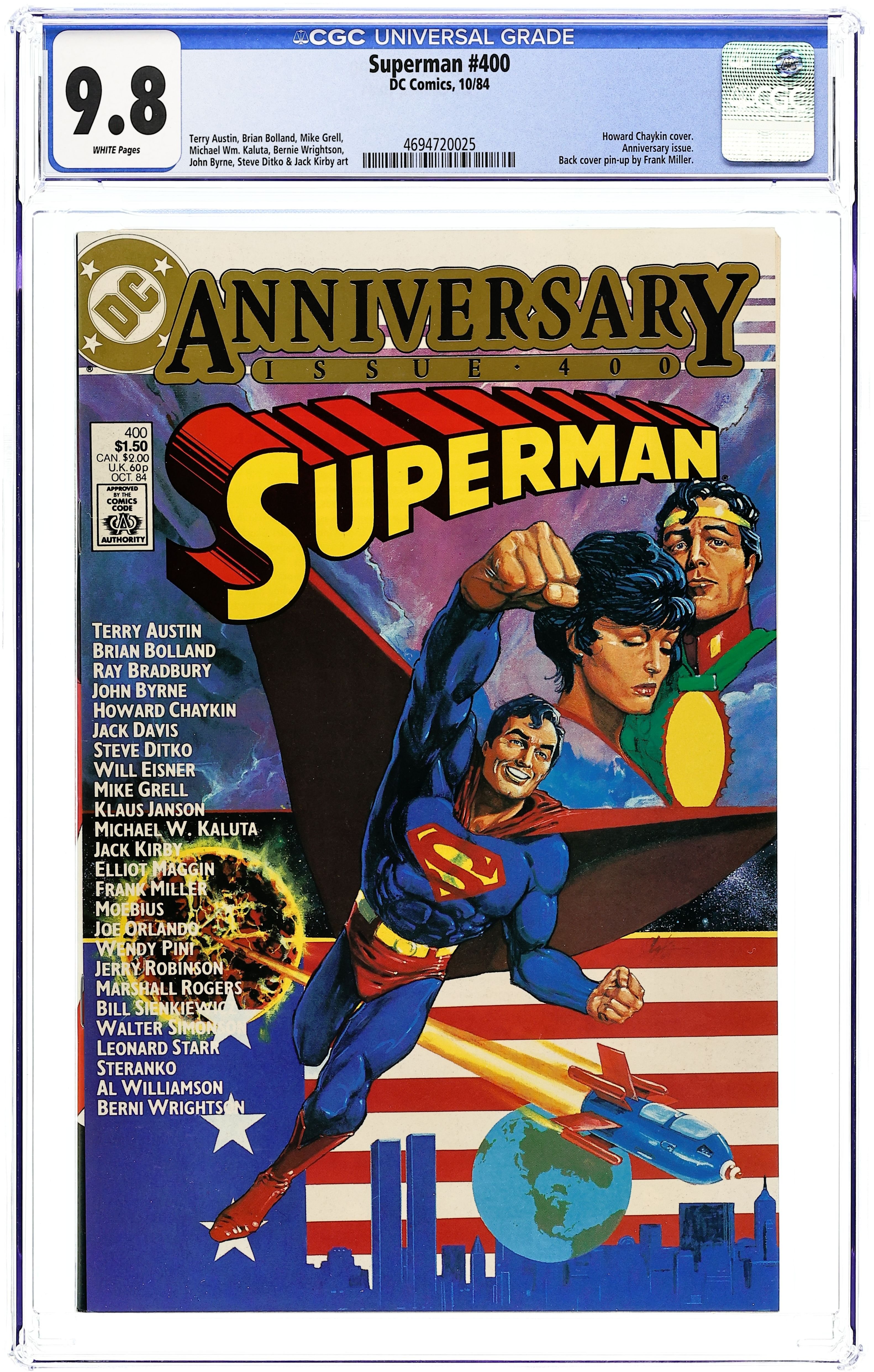 Direct Edition. Giant-Sized 400th Anniversary issue! Introduction by Ray Bradbury. How do people look at Superman? How will we see him in the future, as historians and scholars evaluate this figure who so dominated the 20th century? When he is no longer with us...who will we think he was? Come into the future with us to find out and explore..."The Living Legends of Superman." Script by Elliot Maggin. Art by Joe Orlando (4 pages), Al Williamson (8 pages), Frank Miller (4 pages), Marshall Rogers & Terry Austin (7 pages), Wendy Pini (3 pages), Michael W. Kaluta & Kelly Alder (6 pages), Klaus Janson (10 pages), Jim Steranko (10 pages, and Steranko also handles the script, letters & colors for his sequence). Pin-ups by: Brian Bolland, Jack Kirby & Terry Austin, John Byrne, Jack Davis, Leonard Starr (Superman flying with Annie and Sandy), Walt Simonson, Bernie Wrightson, Will Eisner (Superman and the Spirit), Steve Ditko, Mike Grell, Moebius, Bill Sienkiewicz, Jerry Robinson (Batman, Robin, Joker, Penguin appear in pin-up). Cover by Howard Chaykin. Back cover by Frank Miller. 68 Pages, Full Color. Cover price $1.50.
