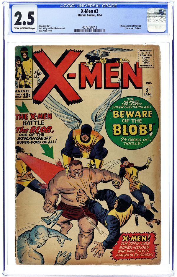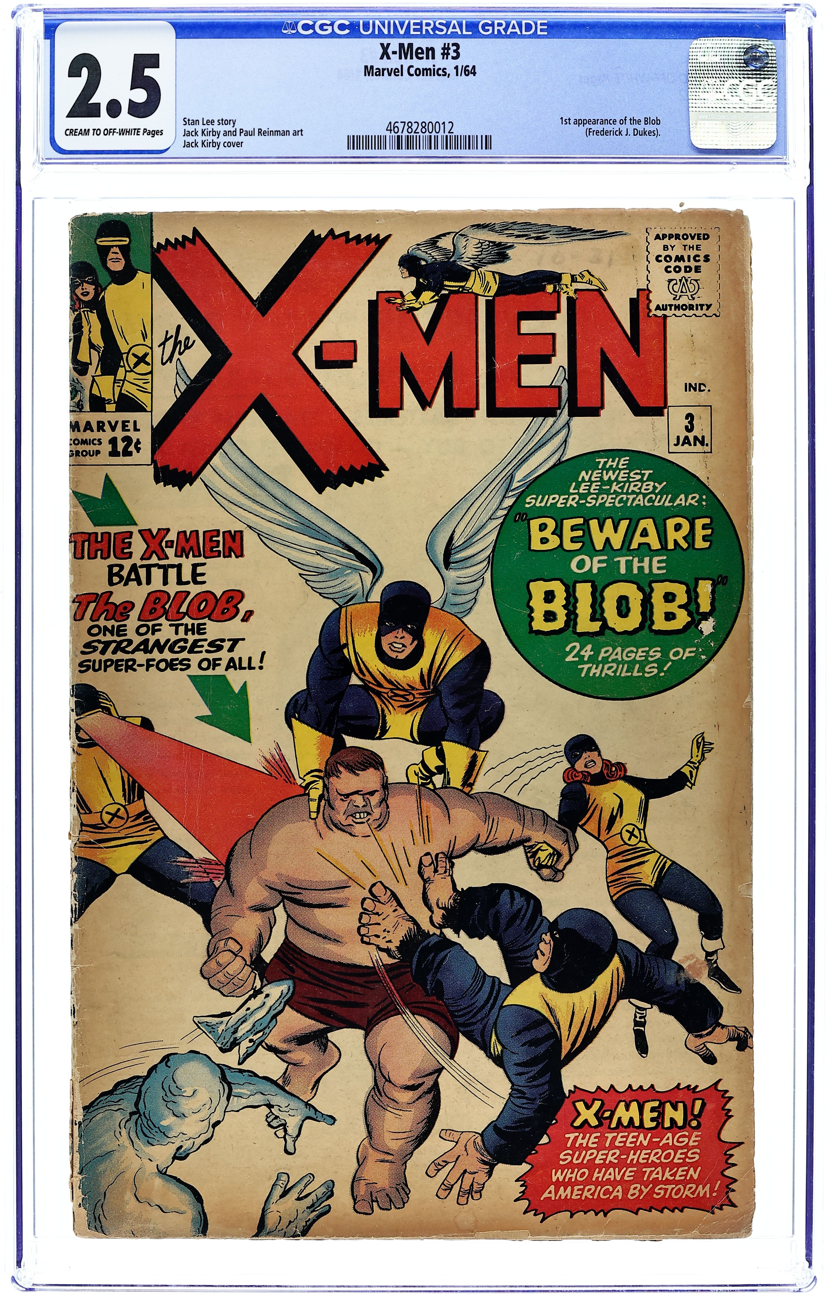 First appearance of the Blob. Cover pencils by Jack Kirby. Beware of the Blob!, script by Stan Lee, pencils by Jack Kirby, inks by Paul Reinman; Professor X detects a new mutant and sends the X-Men to investigate; They arrive at a carnival and encounter the Blob, a very fat sideshow attraction who can bounce bullets off of his malleable hide as well as anchor himself to the earth and become immovable; The X-Men bring him back to the mansion as a potential member but the Blob spurns their invitation and returns to the carnival; Realizing that the Blob knows their secret, the X-Men lure him back to the mansion where Xavier wipes his memory. 36 pgs. $0.12. Cover price $0.12.