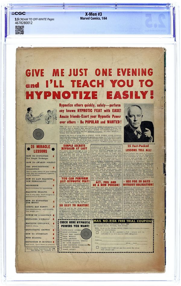Quicksilver, Scarlet Witch, Mastermind, and Toad appear for the 1st time, and Magneto makes his 2nd appearance. Cover pencils by Jack Kirby. The Brotherhood of Evil Mutants!, script by Stan Lee, pencils by Jack Kirby, inks by Paul Reinman; Magneto and his new Brotherhood of Evil Mutants steals a freighter and uses it to take over the South American nation of Santo Marco; The X-Men invade and take the country back; Xavier is caught in an explosion and loses his mental powers. 36 pgs. Cover price $0.12.