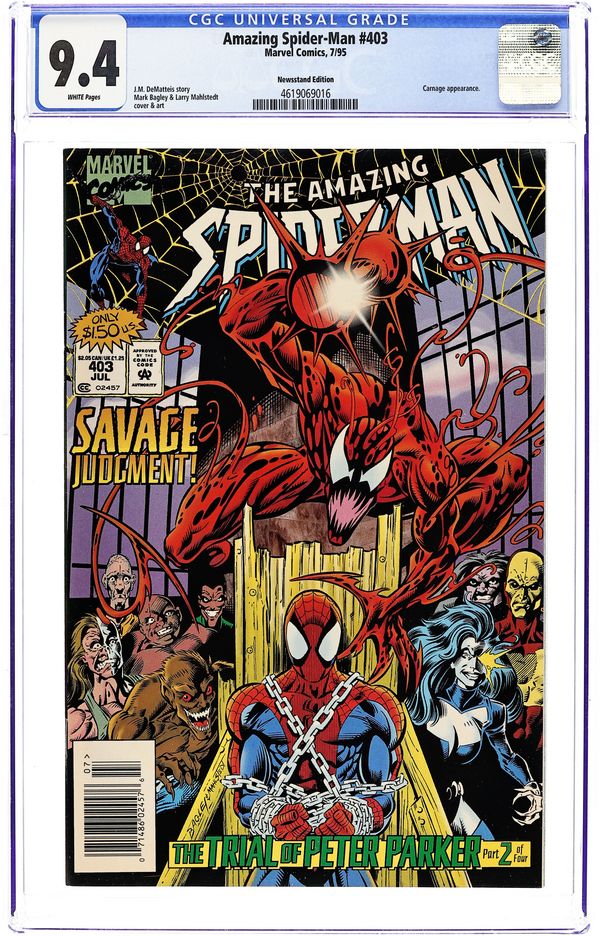 "The Faceless Man" Pursuit Part 4 of 4. Script by J.M. DeMatteis. Pencils by Mark Bagley. Inks by Randy Emberlin. Cover by Mark Bagley. Story continues from Web of Spider-Man 112. The web-slinger's frenzied pursuit of the Chameleon is almost over! As the enraged wall-crawler corners his faceless foe inside Kraven's former estate. The crafty Chameleon tries his best to stop the spectacular one, but he is no match for the emotionally-charged Spider-Man! After his resounding victory, the web-slinger searches through the Chameleon's computer to discover the true mastermind behind his parents' resurrection! The shocking truth has an all too familiar green and purple tinge! Cameo appearance by Harry Osborn. Flashback cameos by Kraven the Hunter and the Richard Parker LMD. First $1.50 cover price. (Notes: This issue includes a full-page ad for the Hulk vs. Venom Special Edition (1994). This issue begins J.M. DeMatteis' one-and-a-half year run as the writer of the Amazing Spider-Man title. This issue also includes 3 Marvel Masterprints Spider-Man cards. The issue may or may not contain the cards now.) 44 pgs. Cover price $1.50.